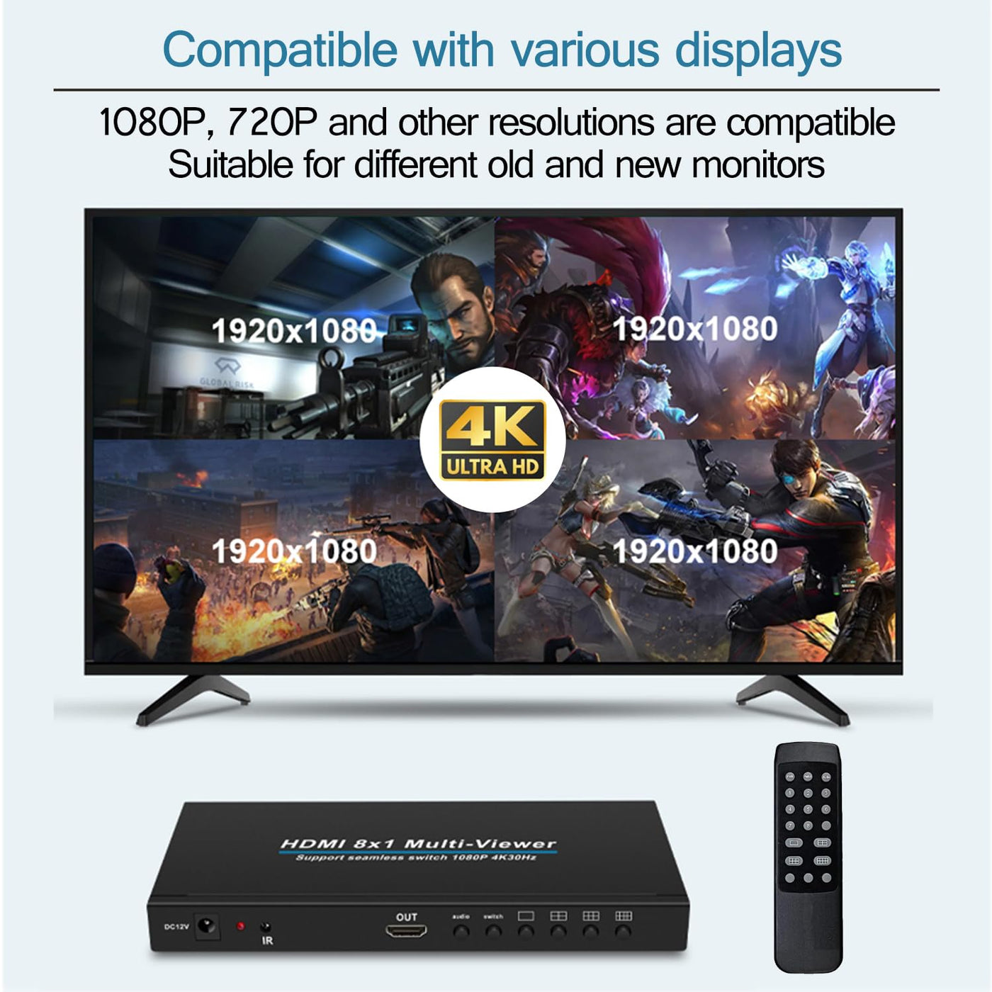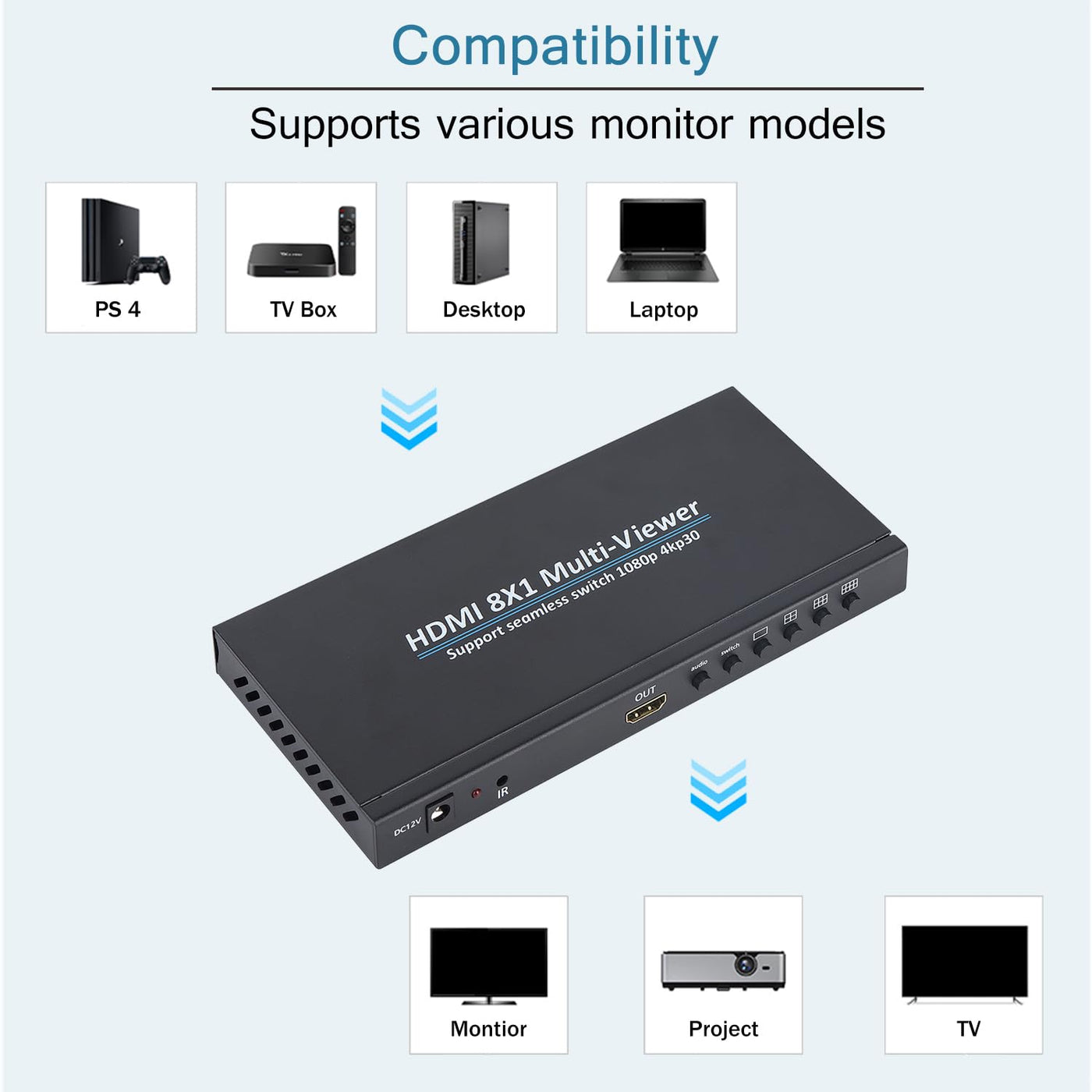 Hdmi Quad Multiviewer 8X1, Seamless Switcher 8 In 1 Out With Ir Remote Control, Support 1080P 4K@30Hz And 6 Viewing Modes