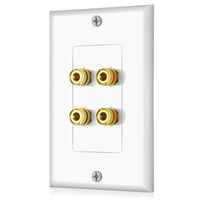 4 Banana Ports For 2 Speakers Wall Plate: Gold Plated 4 Banana Binding Post For 2 Speakers. It Is Made Of Hard Plastic - Abs, Tough, Durable And It Is Widely Used Housing Material Of Electrical Appliances That Protect Against Damages. Two-Piece And Standard Single Gang Design Is Easy To Install, It Comes With Components And Screws Required For Installation That Fits New Installation Or Replacement. It Is Not Necessary To Purchase Additional Parts Or Components. Simply Assembly The Connectors To The Wall Plate And Fix The Wall Plate By The Screws Given. It Does Not Even Require Soldering For Installation. Each Side Of The Wall Plate Has A Universal Binding Post, Which Is Compatible With Bare Wire, Spades, Or Banana Plugs. Installation Guide: 1.Connect The Banana Plug, Spade Connecter Or Speaker Wire To The Back Of The Binding Posts In The Insert 2.Fasten The Banana Post Insert To The Faceplate With The Shorter Screws 3.Attach The Assembled Wall Plate To The Wall Bracket 4.Connect The Banana Plugs, Spade Connectors Or Speaker Wire To The Front Package Content: One Unit Of Wall Plate With 4 Banana Binding Posts And 4 Screws Required For Installation