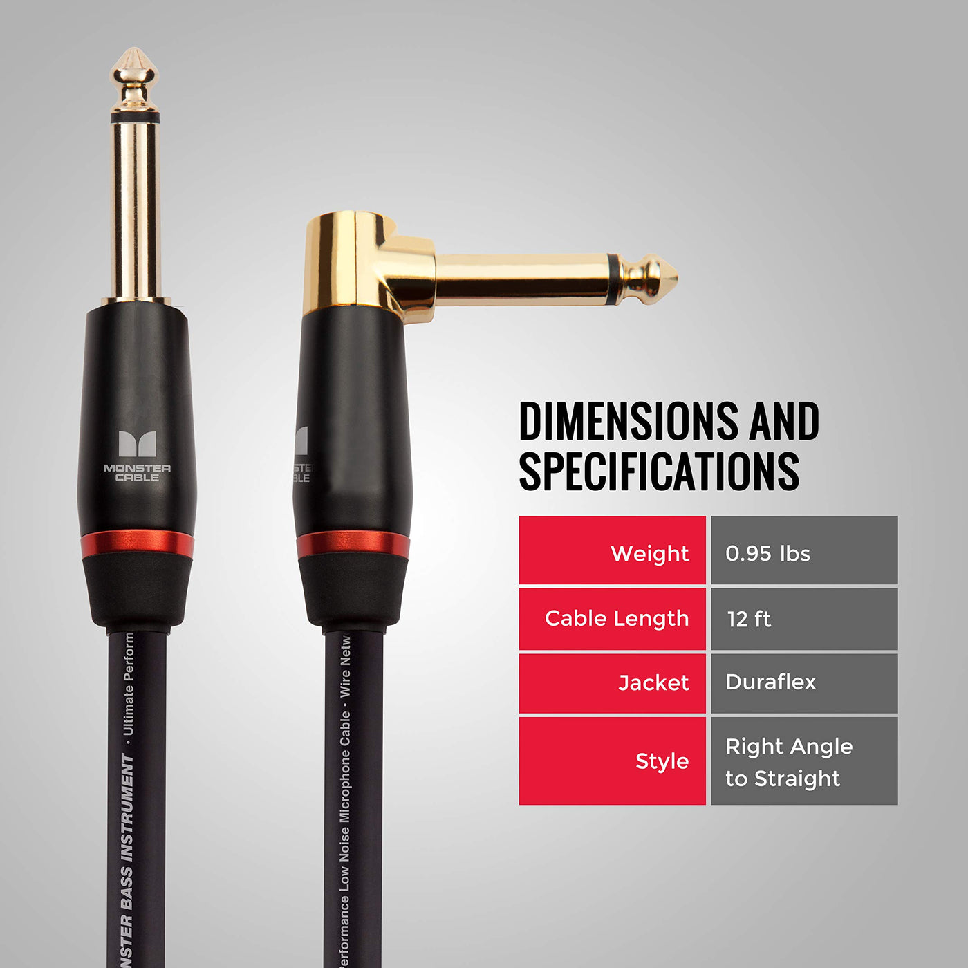 Monster Prolink Monster Bass Instrument Cable. 12 Ft Guitar Cable. Right Angle To Straight Bass Guitar Cable. 95% Copper Braided