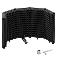 Product Description: Moukey Tabletop Compact Microphone Isolation Shield /Pop Filter, High Density Absorbent Foam Moukey Isolation Shield Equipped An Acoustic Foam Front And A Vented Backplate, Which Allows The Microphone To ''Breathe'' And Prevents Reflections Within The Arc Of The Shield. It Uses A Dual Clamp Mounting Bracket, Which Attaches To Booms Or Stands Up To 3/8- 5/8'' In Diameter. Two Outer Panels Can Be Folded Inward For Storage Or For Creating A Tighter Acoustic Isolation Chamber. Can Be Used In A Normal Upright Orientation Or Can Be Inverted, So That The Microphone Hangs Down Inside The Chamber. Specification: Color:Black Material:Metal + Abs Plastic Net Weight: 3.263 Lb / 1.48 Kg Package Dimensions:8.27(L)X 7.67 (W) X 12.99 (H)Inch / 21 X 19.5 X 33 Cm Package Included: 1X Microphone Isolation Shield 1X Hexagon Screw Handle 1X 3/8 To 5/8 Nut 1X 5/8 To 3/8 Nut