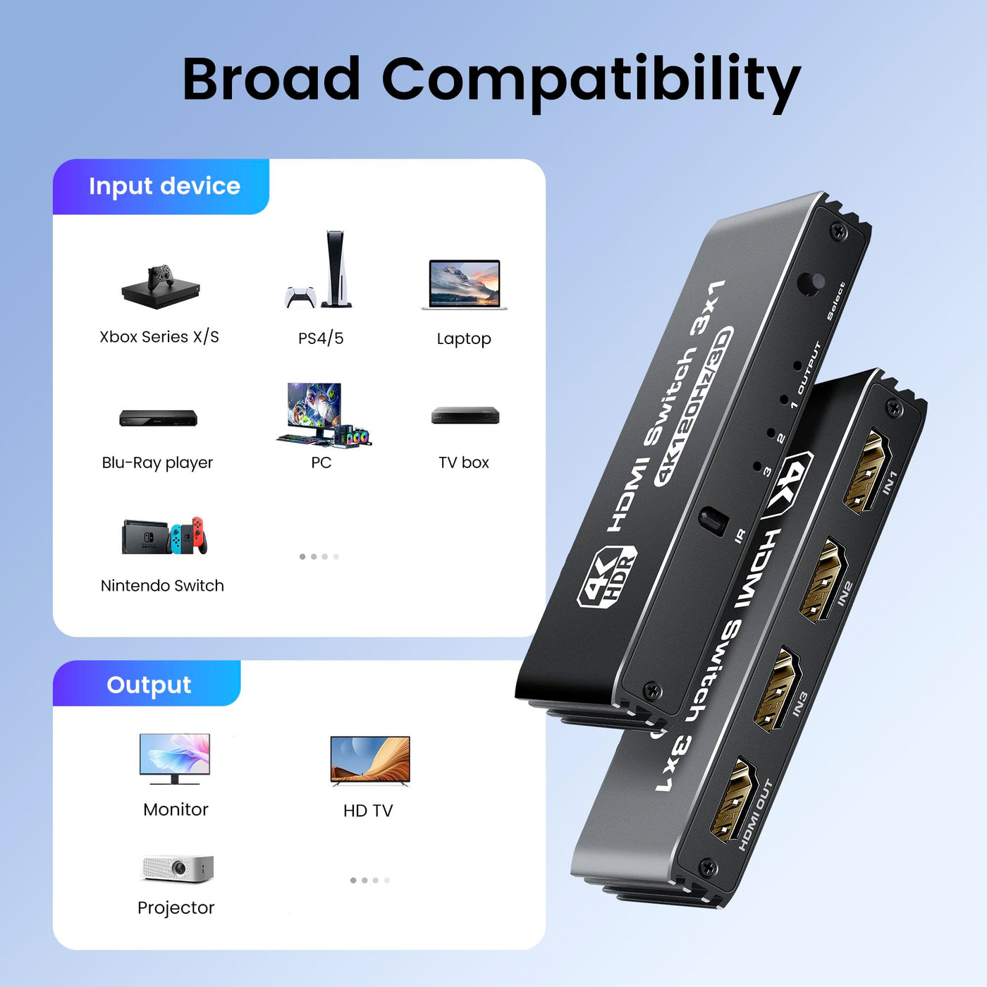 Newcare 3 Ports Hdmi 2.1 Switch Box 4K@120Hz: Ultimate Hdmi Switcher For All Your Devices Introducing The Newcare 3 Ports Hdmi 2.1 Switch Box 4K@120Hz, The Perfect Solution For Managing Multiple Hdmi Sources With Ease And Efficiency. This Advanced Hdmi Switcher Offers A Seamless Way To Connect And Switch Between Up To Three Different Hdmi Devices, Ensuring An Uninterrupted And High-Quality Viewing Experience. Whether You'Re A Gamer, A Movie Enthusiast, Or Someone Who Loves Streaming Content, This Hdmi Switcher Is Designed To Meet All Your Needs. Hdmi Switch 3 In 1 Out: Effortlessly Manage And Switch Between Three Different Hdmi Sources With A Single Output Port. This Hdmi Switch Box Is Perfect For Connecting Your Devices Like The Ps5, Xbox, Pc, Or Streaming Devices, Eliminating The Hassle Of Constantly Plugging And Unplugging Cables. Enjoy The Convenience Of Having All Your Favorite Devices Connected Simultaneously. Stunning 4K@120Hz And Vrr/Allm Support: Experience Breathtaking Visuals With The Hdmi Switch 4K 120Hz Support, Ensuring Ultra-Smooth Motion And Crystal-Clear Images. This Feature Is Ideal For High-Definition Gaming, Allowing You To Enjoy Your Favorite Games In Stunning Clarity And Detail. The Switcher Also Supports Variable Refresh Rate (Vrr) And Auto Low Latency Mode (Allm), Providing A Superior Gaming Experience By Minimizing Input Lag And Preventing Screen Tearing. Additionally, This 8K Hdmi Switch Is Future-Proof, Ensuring Compatibility With Upcoming High-Definition Standards, Making It A Long-Term Solution For Your Entertainment Setup. Advanced Hdr And 3D Audio: Enhance Your Viewing And Listening Experience With Advanced Hdr Technology That Offers Deeper Contrasts And More Vivid Colors. This Ensures That Every Scene Is Displayed With Optimal Brightness And Color Accuracy, Making Your Movies And Shows Look More Lifelike. The Hdmi Selector Switch Also Supports Immersive 3D Audio, Delivering Superior Sound Quality That Makes You Feel Like You'Re Part Of The Action. Whether You'Re Watching A Movie Or Playing A Game, The Sound Quality Will Be Exceptional. Remote Control And Auto-Switching: Easily Switch Between Devices Using The Included Remote Control, Providing You With The Convenience Of Managing Your Hdmi Sources From The Comfort Of Your Couch. The Intelligent Auto-Switching Feature Automatically Detects And Switches To The Active Hdmi Device, Ensuring A Hassle-Free And Convenient Operation. This Means You Won'T Have To Manually Switch Inputs Every Time You Change Devices, Making Your Entertainment Experience Smoother And More Enjoyable. Neatly Packed Goodies: Inside The Box, You'Ll Find Everything You Need To Get Started With Your Ultimate Entertainment Setup. The Package Includes Our Hdmi 2.1 Switch, A Remote Control, And An Instruction Manual. This 3 Port Hdmi Switch Is Designed To Be User-Friendly, Allowing You To Set Up And Start Using It Right Away. The Compact And Durable Design Ensures That It Will Fit Neatly Into Your Existing Setup Without Taking Up Too Much Space. Key Features: Hdmi Switch 3 In 1 Out For Seamless Switching Between Three Hdmi Sources Supports Stunning 4K@120Hz Resolution For Crystal-Clear Visuals Compatible With 8K For Future-Proofing Your Setup Advanced Hdr And 3D Audio For An Immersive Viewing Experience Variable Refresh Rate (Vrr) And Auto Low Latency Mode (Allm) For Superior Gaming Remote Control And Auto-Switching For Easy Operation Conclusion: The Newcare 3 Ports Hdmi 2.1 Switch Box 4K@120Hz Is The Ultimate Hdmi Switcher For Anyone Looking To Enhance Their Entertainment Experience. With Its Advanced Features, User-Friendly Design, And High Compatibility, It Is The Perfect Addition To Any Home Theater Or Gaming Setup. Get Ready To Elevate Your Entertainment With This Versatile And Powerful Hdmi Switcher.