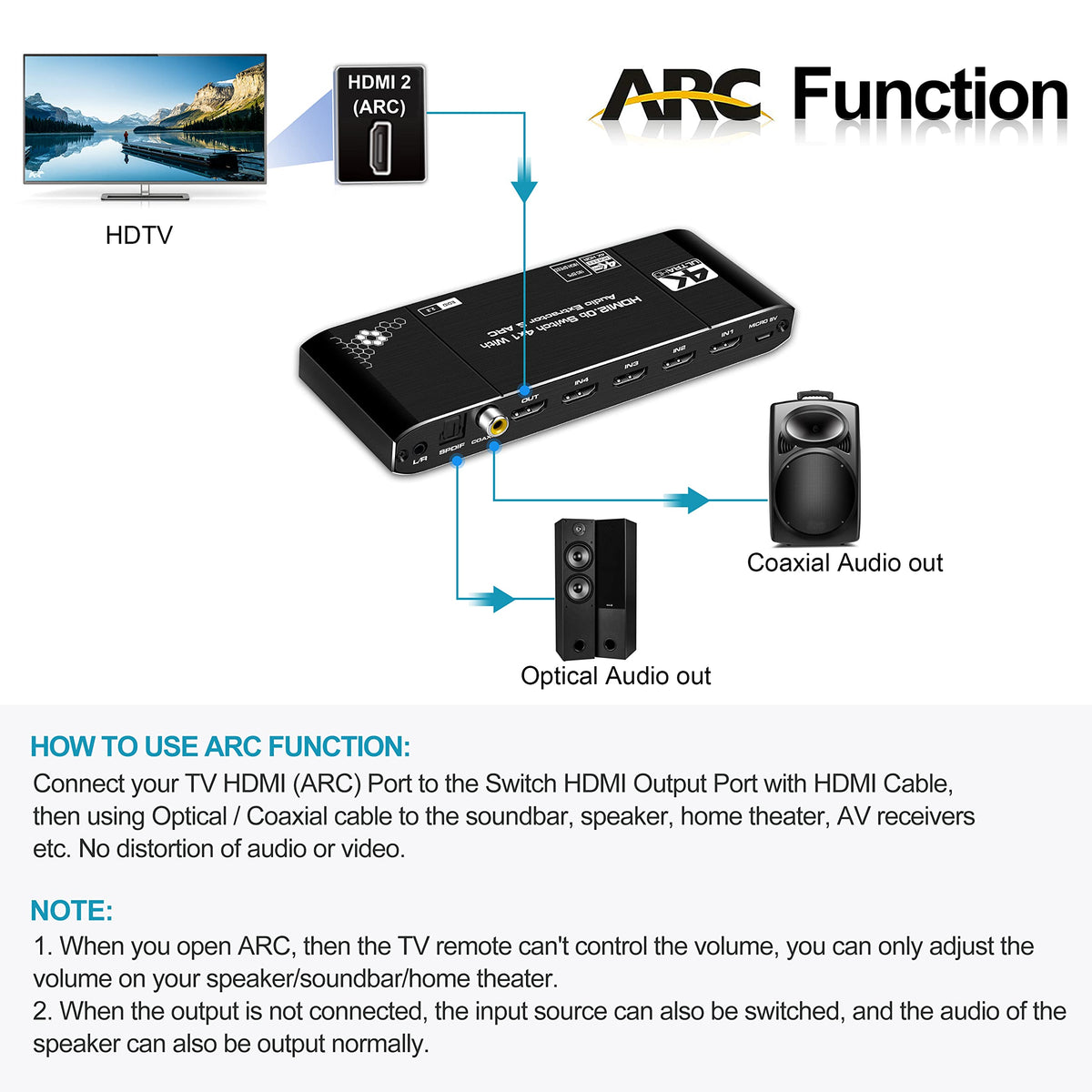 ?? Arc: First, Please Make Sure Your Display Support Arc Function. Second, Using Hdmi Cable Plug Into Hdmi Arc Port On Your Display And The Other Side Plug Into The Hdmi Output On The Switch.