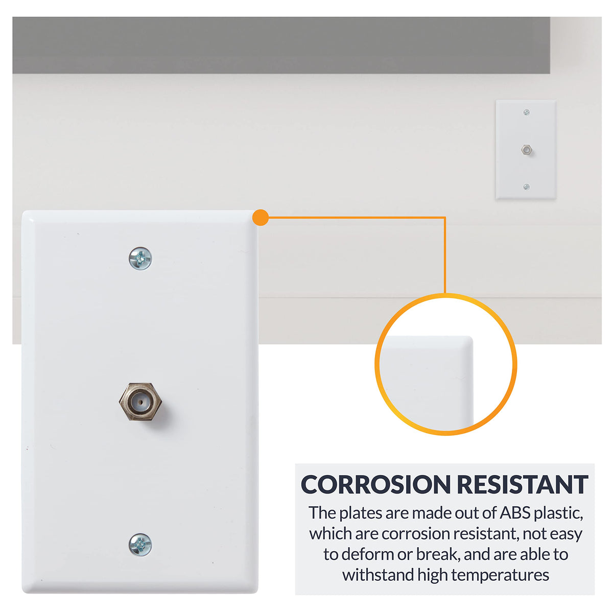 1-Pack Of Single-Gang Wall Plate With Mounting Hardware Included. Wall Plate Measures About 4.5 X 2.75 In. The Plate Is Made From Abs Plastic, Which Are Corrosion Resistant, Hard To Break And Can Withstand High Temperatures. Standard F-Type Connector Attached To A Coaxial Cable Is Used To Connect Devices Such A Modem, Router, Or Catv Box For Video And Internet Services To The Wall Jack Plate.