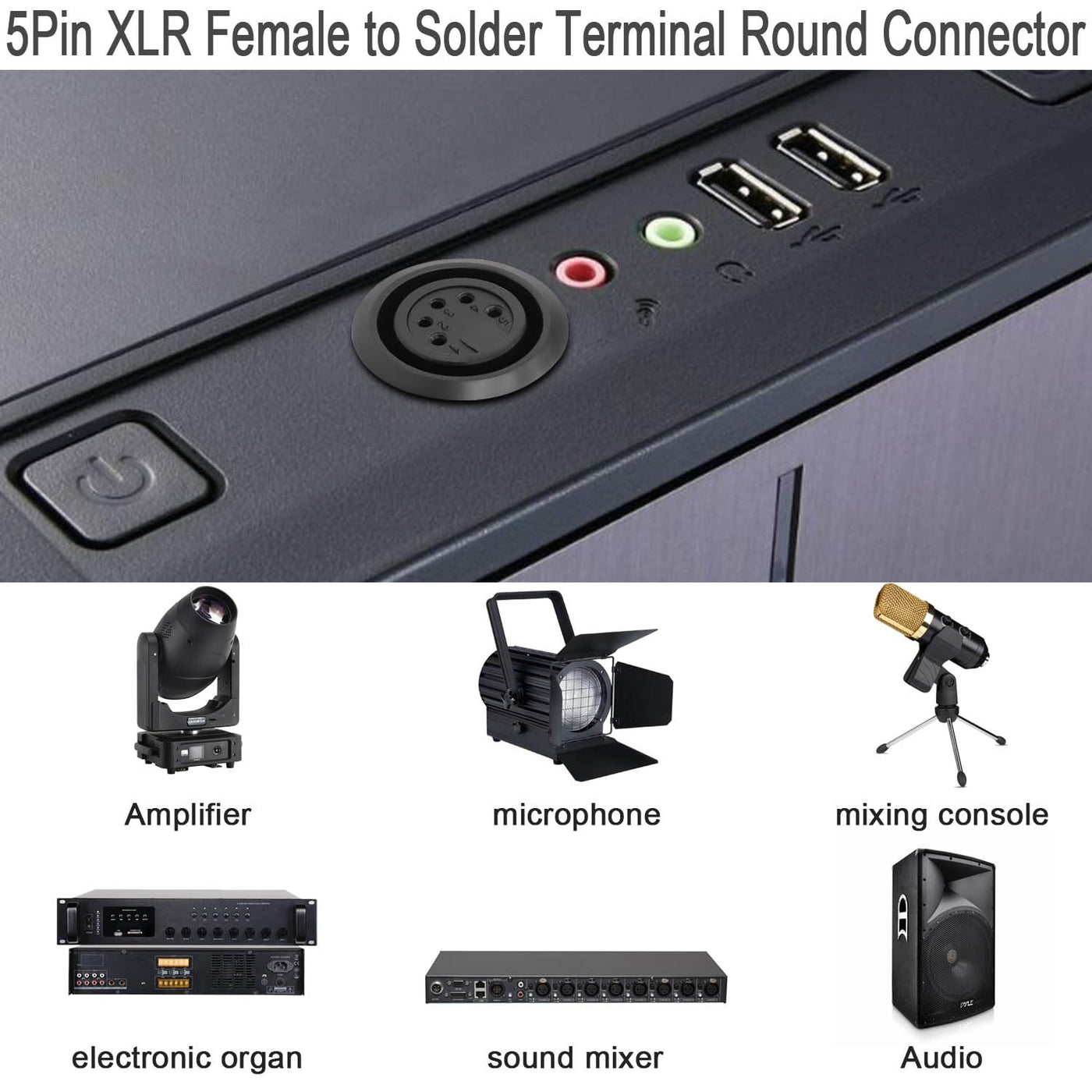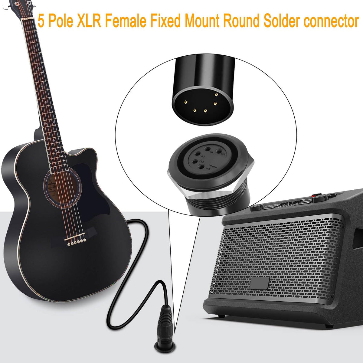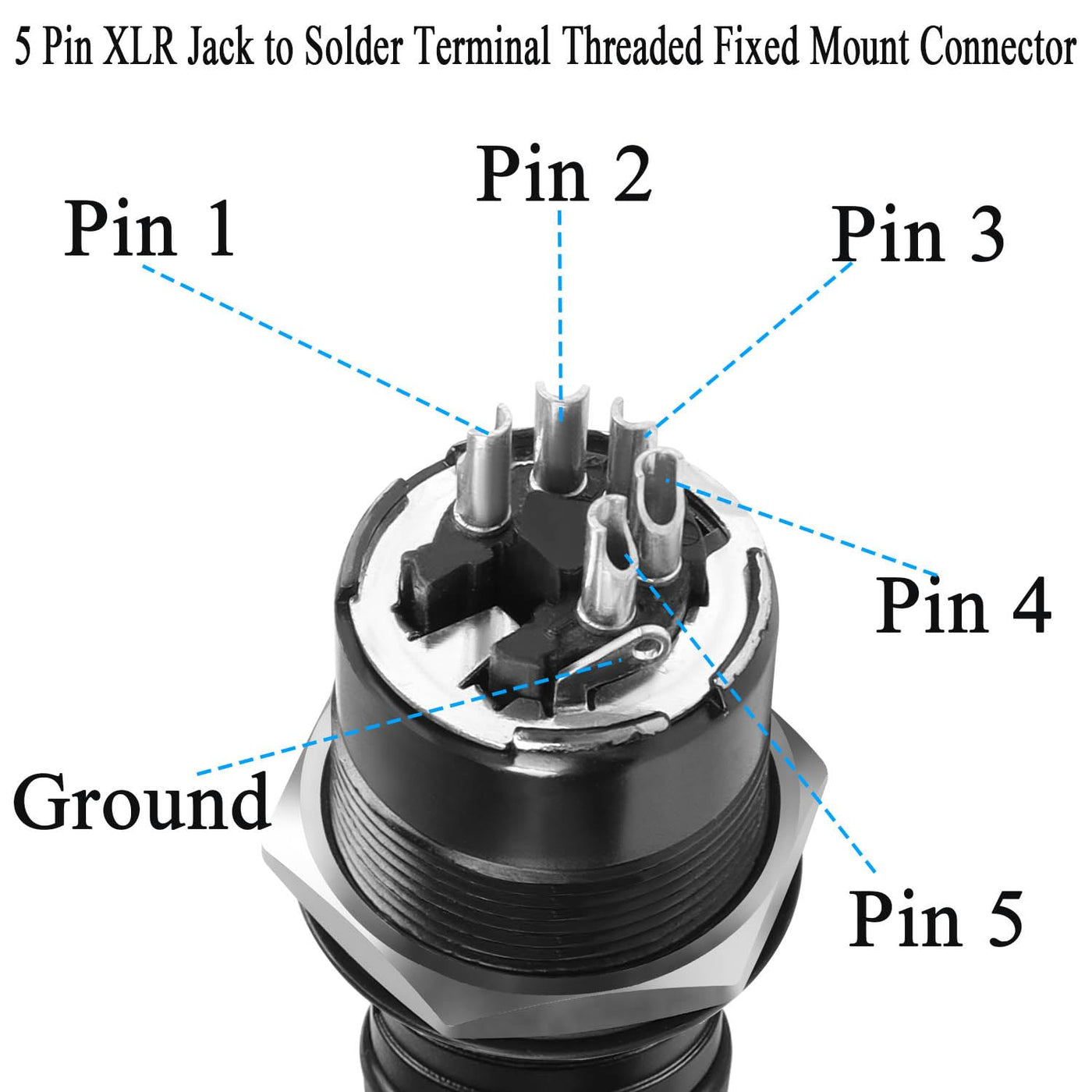 5 Pin Xlr Jack Threaded Fixing Round Soldered Connectors. Standard 5 Pole Xlr Connector For Custom Sound/Dmx Stage Lighting System Input/Output Configurations, Providing A Rugged Connection. Compatible With Dmx Stage Lighting Equipment With 5Pin Xlr Connectors. From Moving Heads, Standard Lights, Spotlights To Uplights. Can Also Be Used For Speakers, Amplifiers, Microphones, Mixers And More. Ideal For Professional Use In Your Studio Or On Stage.5+1 Soldering Pins, No Professional Soldering Required. Simply Insert The Cable Into The Hole And Tin Solder. Its Zinc Alloy Housing, Rugged And Durable, Can Meet The Specific Needs Of Some Harsh Conditions. Interface A: 5 Pin Xlr Female / 5 Pole Cannon Connector&Nbsp; &Nbsp;&Nbsp; Interface B: 5+1 Solder Pin Type: Soldered Features: Threaded Fixed Mounting Thread Size: M22*1 Mounting Plate Thickness: =8Mm (0.3In) Mounting Hole Diameter: F22.5Mm (F0.88In) Housing:Zinc Alloy&Nbsp; &Nbsp; &Nbsp; &Nbsp; &Nbsp; &Nbsp; &Nbsp; &Nbsp; &Nbsp; &Nbsp; &Nbsp; &Nbsp; &Nbsp;&Nbsp; Colour:Black Package:1*5Pin Xlr Female Threaded Fixing Welding Adapter, 1*O Ring Seal, 1*Hexagonal Nut