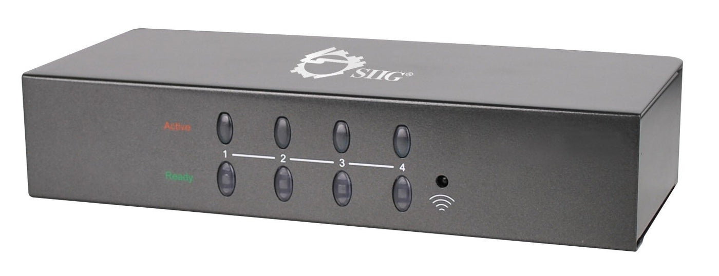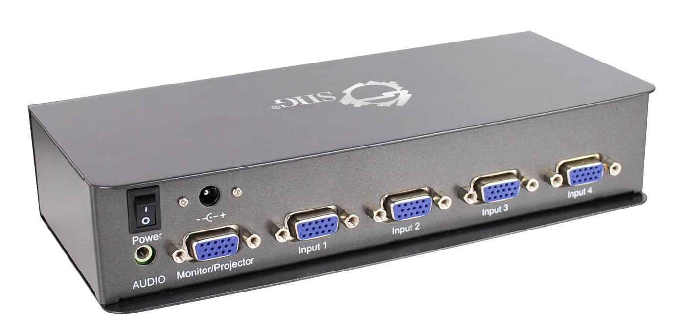 :Siig'S 4X1 Vga And Audio Switch With Ir Allows You To Switch Between Four Computers To Share A Vga Monitor And A Set Of Speakers. It Supports Up To 1920 X 1440 Resolution, Vga, Svga, Xga, Uxga, And Multi-Sync Monitors, Analog Stereo Audio (Via 3.5Mm Audio Jacks), And Video Bandwidth Of Up To 300 Mhz With Operating Distance Up To 50 Meters (164 Feet). The 4X1 Vga/Audio Switch With Ir Features Metal Housing To Ensure The Most Durable And Reliable Setup And Efficient Heat Dissipation For Long Life. It Is A User-Friendly Device Enabling You To Switch Between Multiple Computers Via The Front-Panel Buttons Or Ir Remote Control. Package Contents: -4X1 Vga And Audio Switch With Ir -Power Adapter -Remote Control -Rubber Pads (4) -Installation Guide Connectors: Input: 4X Vga (Db15, Female) Output: 1X Vga (Db15, Female) 1X 3.5Mm Audio Jack (Female) Operating Temperature: 32 To 104 Degrees F (0 To 40 Degrees C) Storage Temperature: 23 To 160 Degrees F (-5 To 70 Degrees C) Housing: Metal Color: Black Product Dimensions: 8.23'' (W) X 3.74'' (H) X 1.71'' (D) Product Weight: 1.85 Lbs Bullets Change To: Switches Between 4 Vga Sources And Shares 1 Vga Monitor Supports Up To 1920X1440 Resolution Supports Analog Stereo Audio Via Audio Jacks Solid Metal Housing Ensures The Most Durable And Reliable Setup Note: Cables Are Not Included