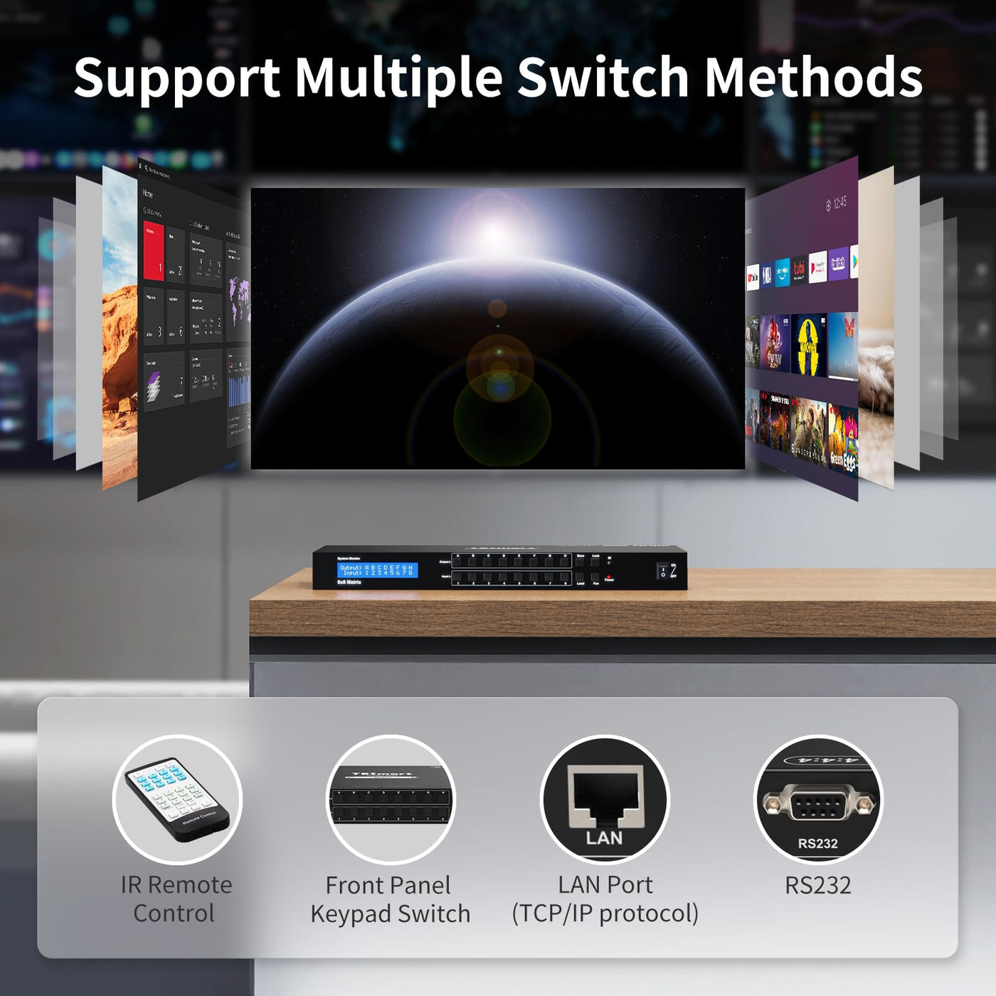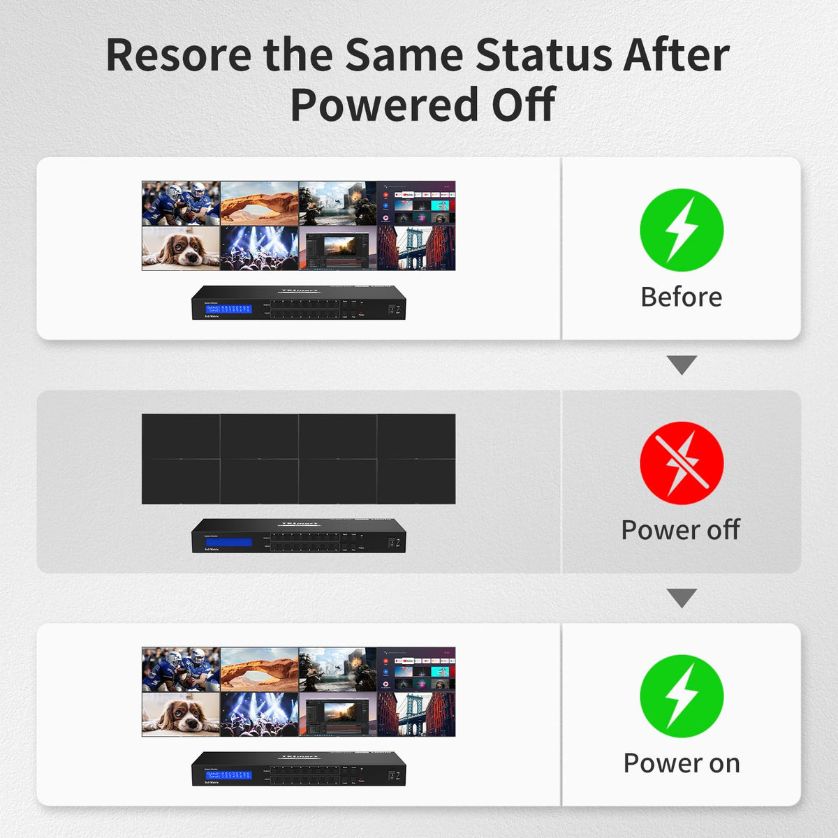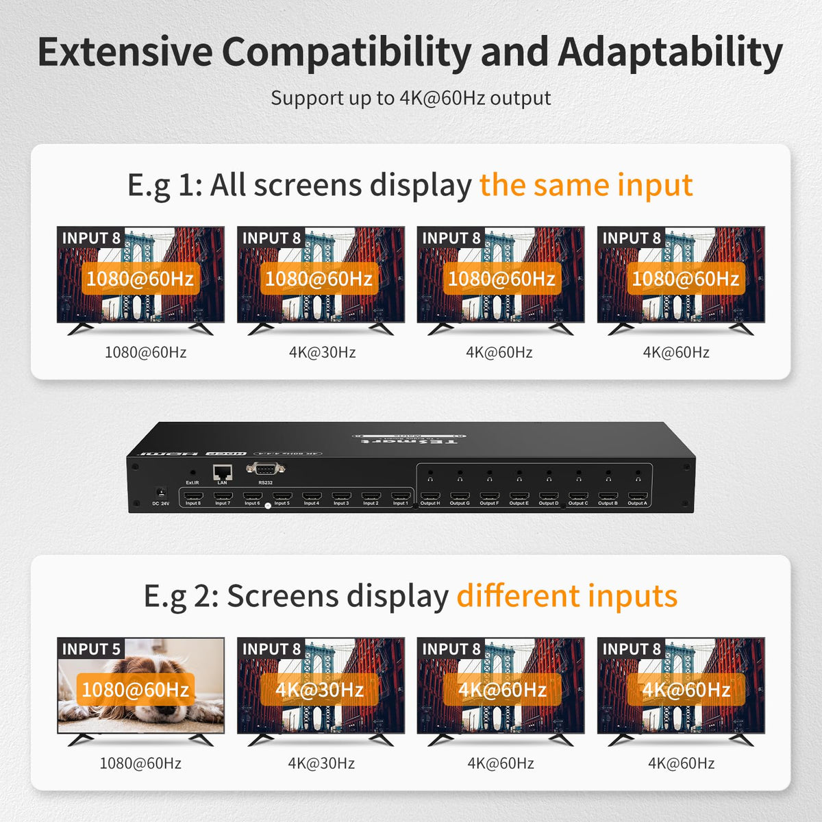 Real 4K@60Hz 4X4 Hdmi Matrix With Popular Functions Tesmart Hdmi Matrix 8X8 Newest 4K@60Hz Switcher Box Designed To Provide A Flexible Method Of Controlling 8 Hdmi Sources To 8 Hdmi Displays. It Routes Any Ultra Hd Source To Any Destination With Lat Est Hdcp Content Protection Version 2.2. Specifications: 1. Support Resolution Up To 3840X2160@60Hz 2. Support Pcm, Dolby Ac3, Dts5.1, Dt7.1 And Dsd Audio Format 3. Support Edid Mangement, Make It Compatible With Most Display Devices 4. Matrix Status Could Be Memorized After Power Down, Automatically Restore Previous Matrix Status After Next Power On 5. Support 8 Configurable User Preset Connectionseasy To Control Matrix Via Ir Receiver, Panel Keypad And Pc(Via Lan Port Or Rs232 Port) 6. Support Dvi-D Single Link Sources And Displays With The Use Of Hdmi-To-Dvi Adaptershdcp2.2 Compliant 7. Support Hdr And Dolby Vision8. Support L/R Audio Output Of Each Output Package List: 1 X Tesmart Hdmi Matrix Switch 8X8 1 X 24V Power Adapter 1 X Ir Remote Control 1 X User Manual