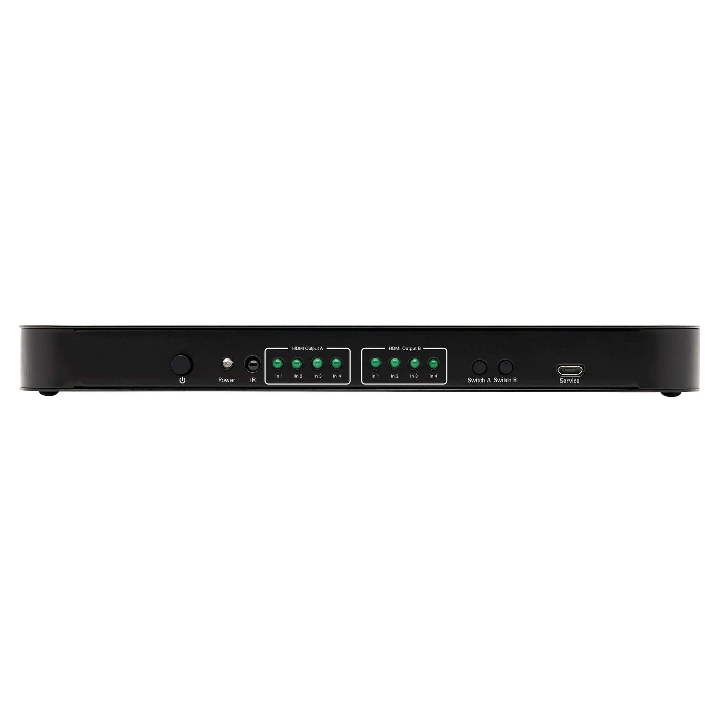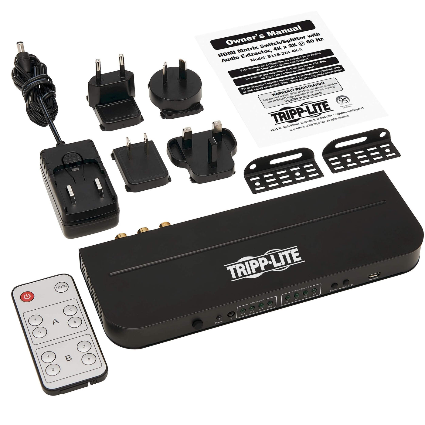 Hdmi Matrix Switch For Digital Signage Or Other Applications With Multiple Video Displays This Matrix Switch/Splitter Features Four Hdmi Inputs And Two Hdmi Outputs. This Allows You To Connect As Many As Four High-Definition Video Sources, Such As Blu-Ray Players, Video Game Systems, Roku Boxes, Laptops, Media Servers Or Cable/Satellite Boxes, And Transmit Them To Two High-Definition Televisions, Projectors Or Monitors. The B118-2X4-4K-A Is Recommended For Home Theaters (Transmit To Hdtvs Located In Different Rooms) Or Digital Signage Applications In Classrooms, Bars, Restaurants, Conference Rooms, Lecture Halls And Trade Shows. Enjoy Great Flexibility In Transmitting Video To Different Displays Or Even Different Rooms Send The Same Video Image To Both Displays Or Transmit Different Videos And Rotate Among Them. You Can Use The Buttons Built Into The Front Of The Unit To Switch Between The Connected Sources Displayed On The Two Monitors. The B118-2X4-4K-A Also Includes An Ir Remote That Lets You Not Only Choose Between The Connected Video Sources, But Also Mute The Sound And Power On/Off The Unit. Transmits Crystal-Clear 4K Hdmi Video With 4:4:4 Color The B118-2X4-4K-A Supports Ultra Hd Video Resolutions Up To 4096 X 2160 (4K X 2K) At 60 Hz With 36-Bit Deep Color. Its Compatible With Hdmi 2.0 Standards For Carrying Hdr (High Dynamic Range) Signals, Which Provides A Wide Range Of Vibrant Colors With Richer Contrast, Brighter Whites And Deeper Blacks. Hdcp 2.2 Compliance Allows You To Stream Itunes And Netflix Content With No Complications. This Switch Also Supports 4:4:4 Chroma Subsampling For Top-Level Pc Gaming Or Using Your Hdtv As A Pc Monitor. Built-In Audio Extractor Lets You Control Sound, As Well As Picture Toslink/Coaxial And Rca Right/Left Audio Ports Allow You To Connect An Amplifier, Receiver Or Soundbar For Optical, Digital Or Analog Sound. The B118-2X4-4K-A Supports 7.1-Channel Lpcm, Dts-Hd Master Audio And Dolby Truehd. Plug-And-Play Operation For Quick Setup And Immediate Use The B118-2X4-4K-A Works Right Out Of The Box With No Software Required. Use Hdmi Cabling (Such As Tripp Lites P569-Series High-Speed Cables, Sold Separately) To Connect Up To Four Sources And Two Displays. The Included Power Supply Comes With Four International Plug Adapters (North America, Europe, United Kingdom, Australia).