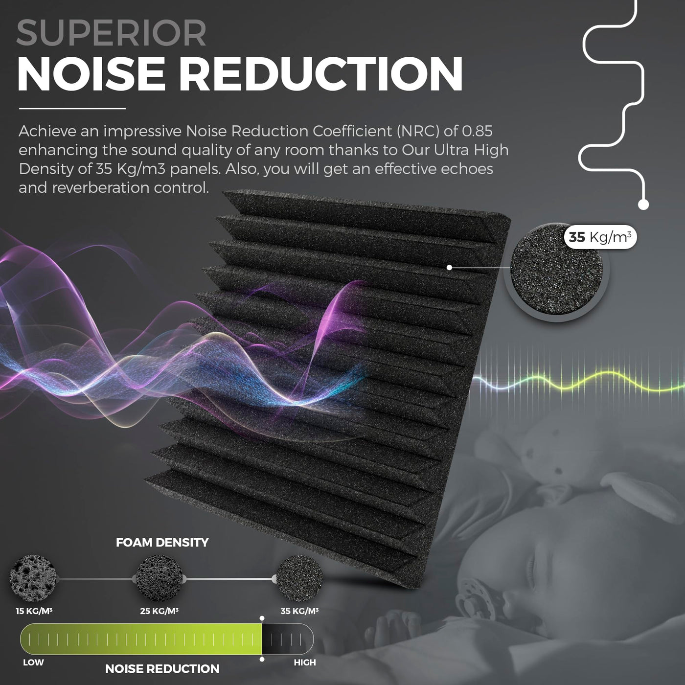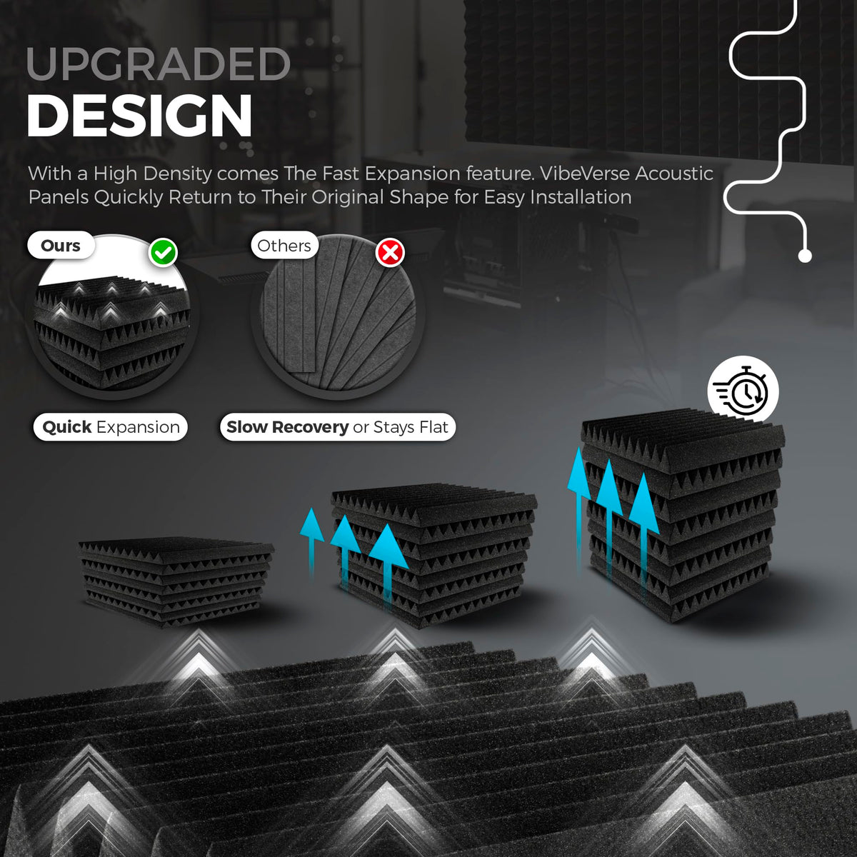 Vibeverse - 24 Pack Self Adhesive Acoustic Foam Sound Absorption Panels, 12 X 12 X 2, Black Wedge Of 12 Lines Design, 35 Kg/M3 H