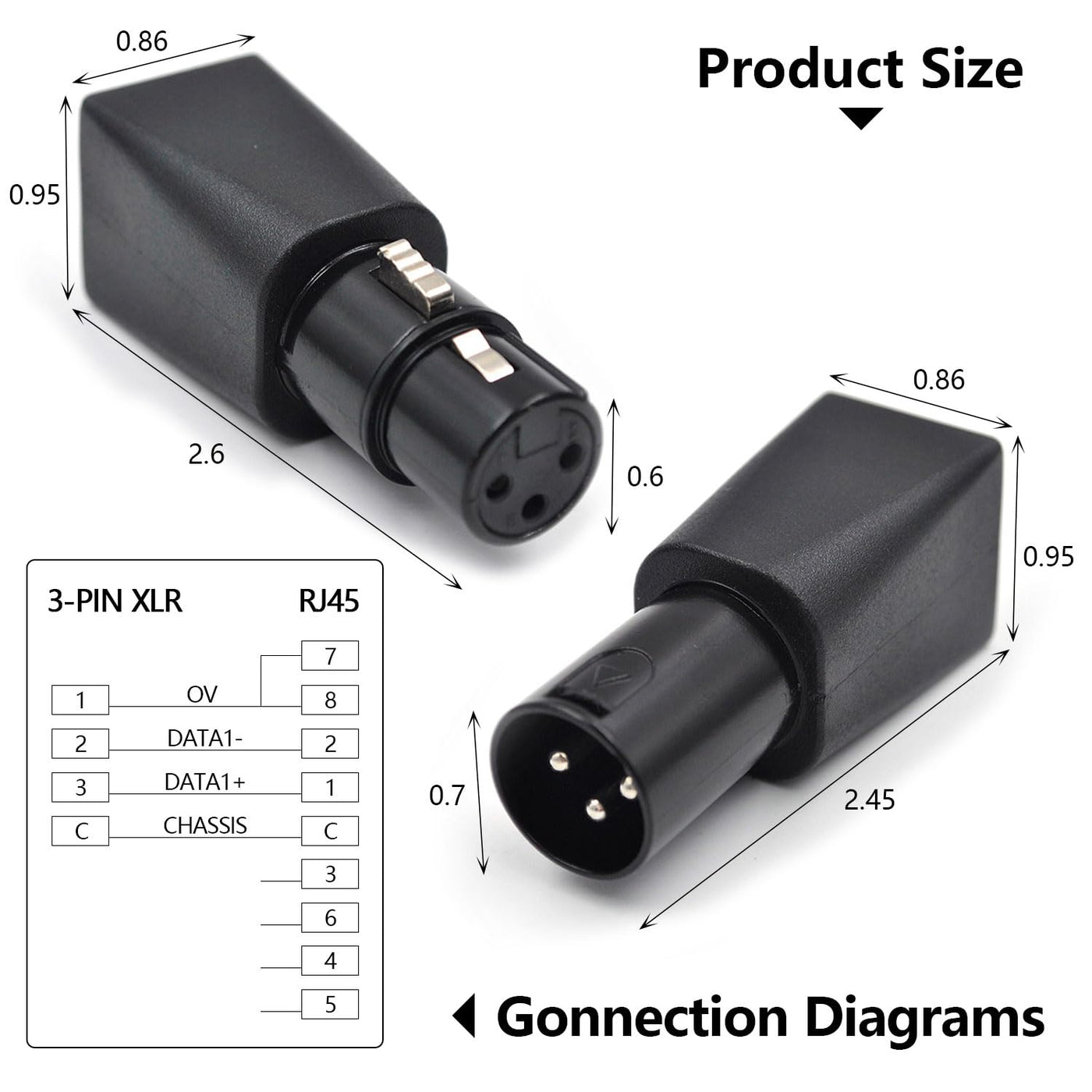 Q: How many adapters are included in the package?A: The package includes 4 XLR to RJ45 Connector DMX to Ethernet Male Adapter Plugs. This gives you multiple adapters for your DMX512 cable needs, which is particularly useful for larger setups.