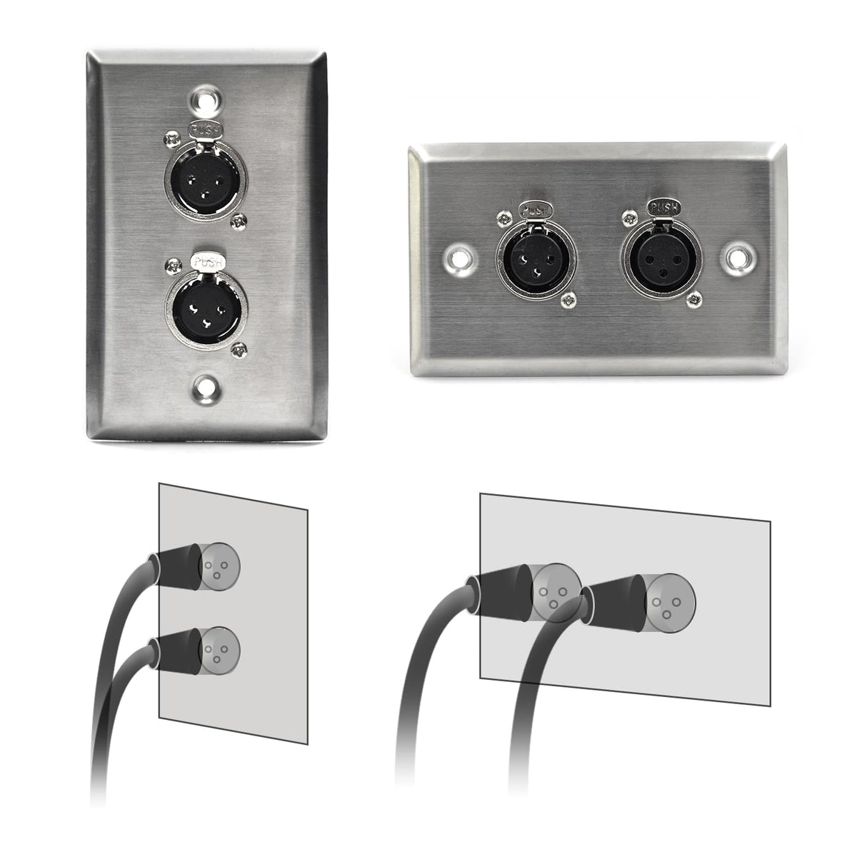 Q: What material are the Zhupoub Dual XLR Female Wall Plates made from?A: These wall plates are constructed from high-quality stainless steel, ensuring durability and a professional appearance suitable for various audio environments.