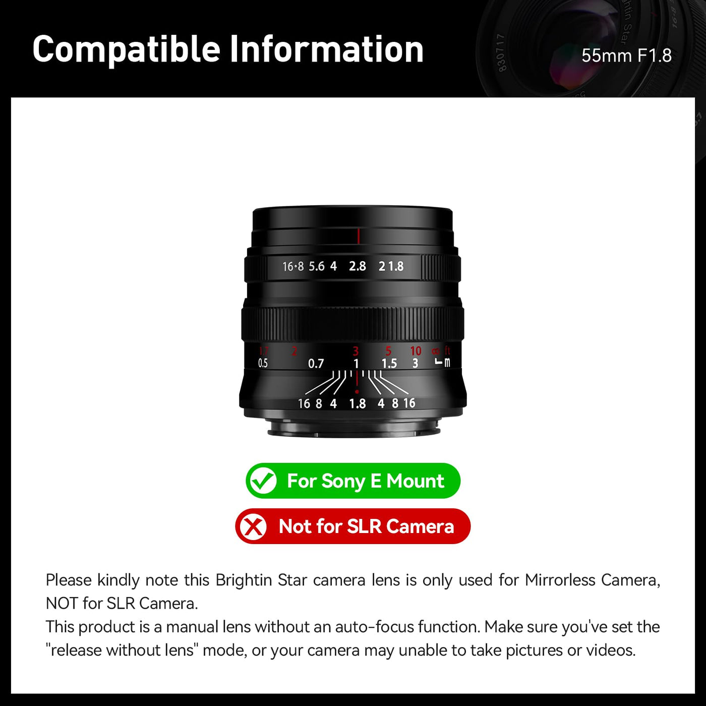 Brightin Star 55Mm F1.8 Full Frame Manual Focus For Sony E Mount Mirrorless Cameras, Large Aperture Standard Fixed Lens, Fit For