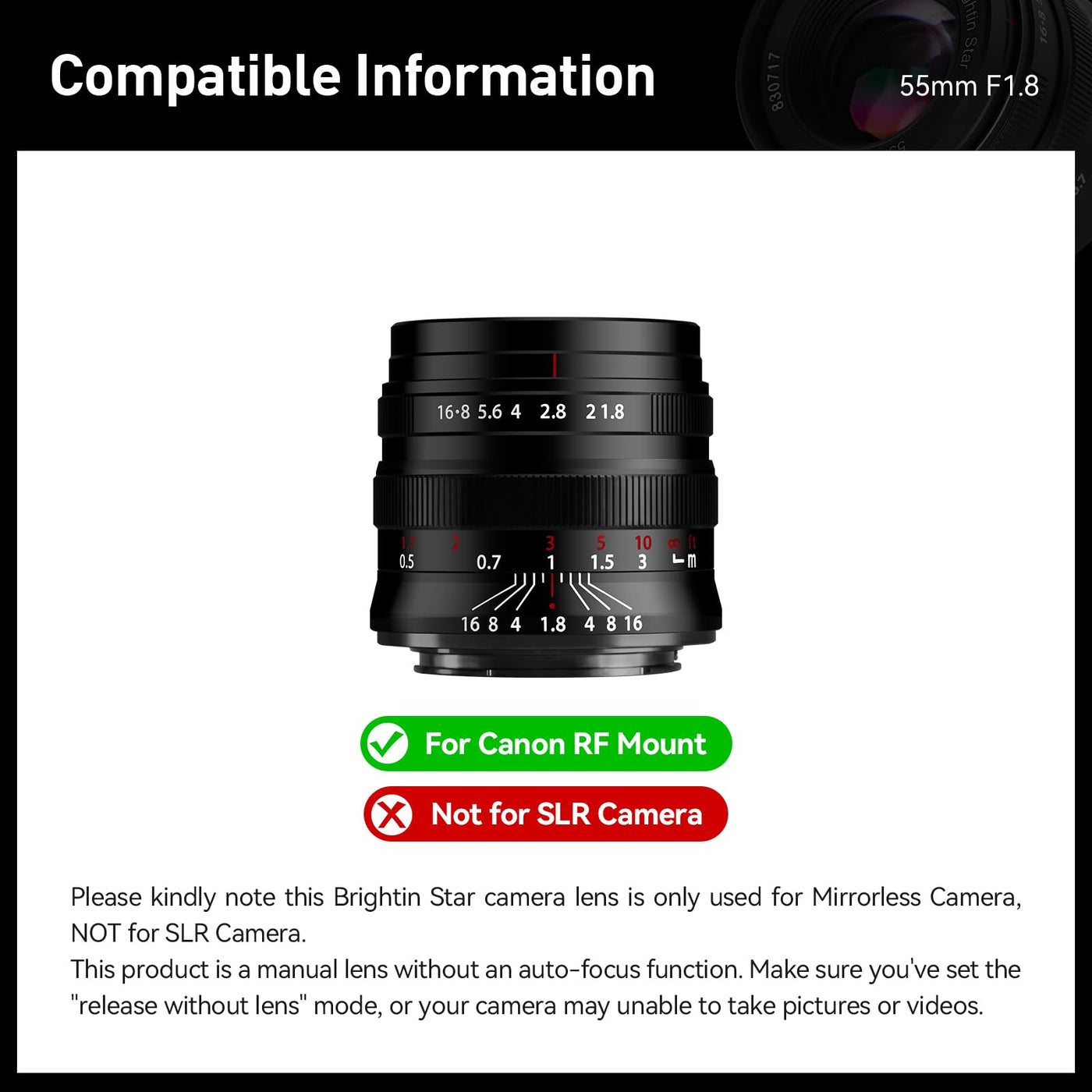Brightin Star 55Mm F1.8 Full Frame Manual Focus Mf Large Aperture Prime Standard Fixed Focal Lens, Fit For Canon Rf Mount Eos Rp