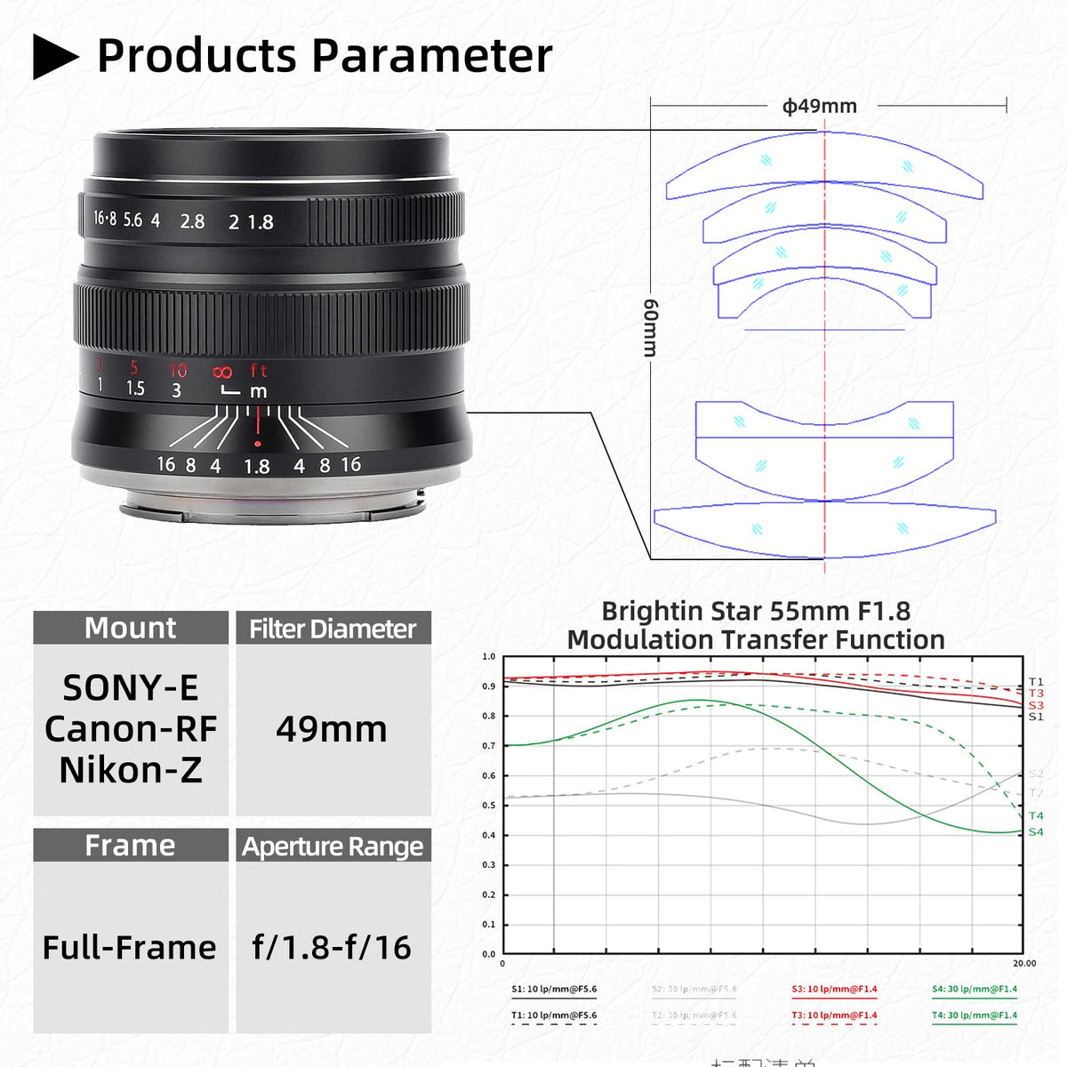 Brightin-Star 55Mm F1.8 Full-Frame Large-Aperture Manual Focus Portrait Photography Mirrorless Camera Lens Is Currently The Highest-Quality And Most Cost-Effective Large-Aperture Lens On The Market. It Is Specially Designed For Mirrorless Cameras.The Lens Adopts Manua-Focus Design, Allowing You To Experience The Fantastic Changes Of The Picture When Focusing. Brightin-Star 55Mm F1.8 Has An Industry-Leading F/1.8 Aperture Full-Frame, Creating Perfect Bokeh-Effects, While Ensuring That More Light Can Still Be Obtained In Night Scenes And Dim Environments. This Lens Adopts A Focal Length Of 55Mm, Which Is The Most Comfortable Distance In Portrait Photography. It Can Perfectly Restore The Effect Of The Human Eye'S Perspective, Simulate The Real Feeling, And Immerse The Viewer In It. Brightin-Star Lens Adopts Multi-Layer Nano-Coating, Which Greatly Reduces Ultraviolet Rays And Stray Light Entering The Lens, Effectively Eliminating Ghosting And Flare, While Improving Light Transmission And Providing Better Picture Quality.