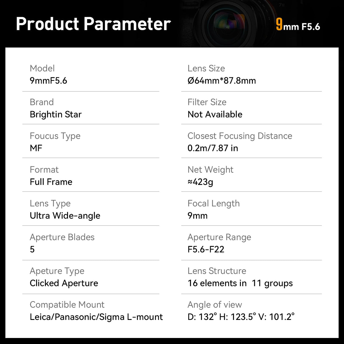 Brightin Star 9Mm F5.6 Full Frame Ultra Wide Manual Prime Lens, Fit For L Mount Leica Sl, Sl2, T, Tl, Tl2, Tl18, Cl/Panasonic Lu