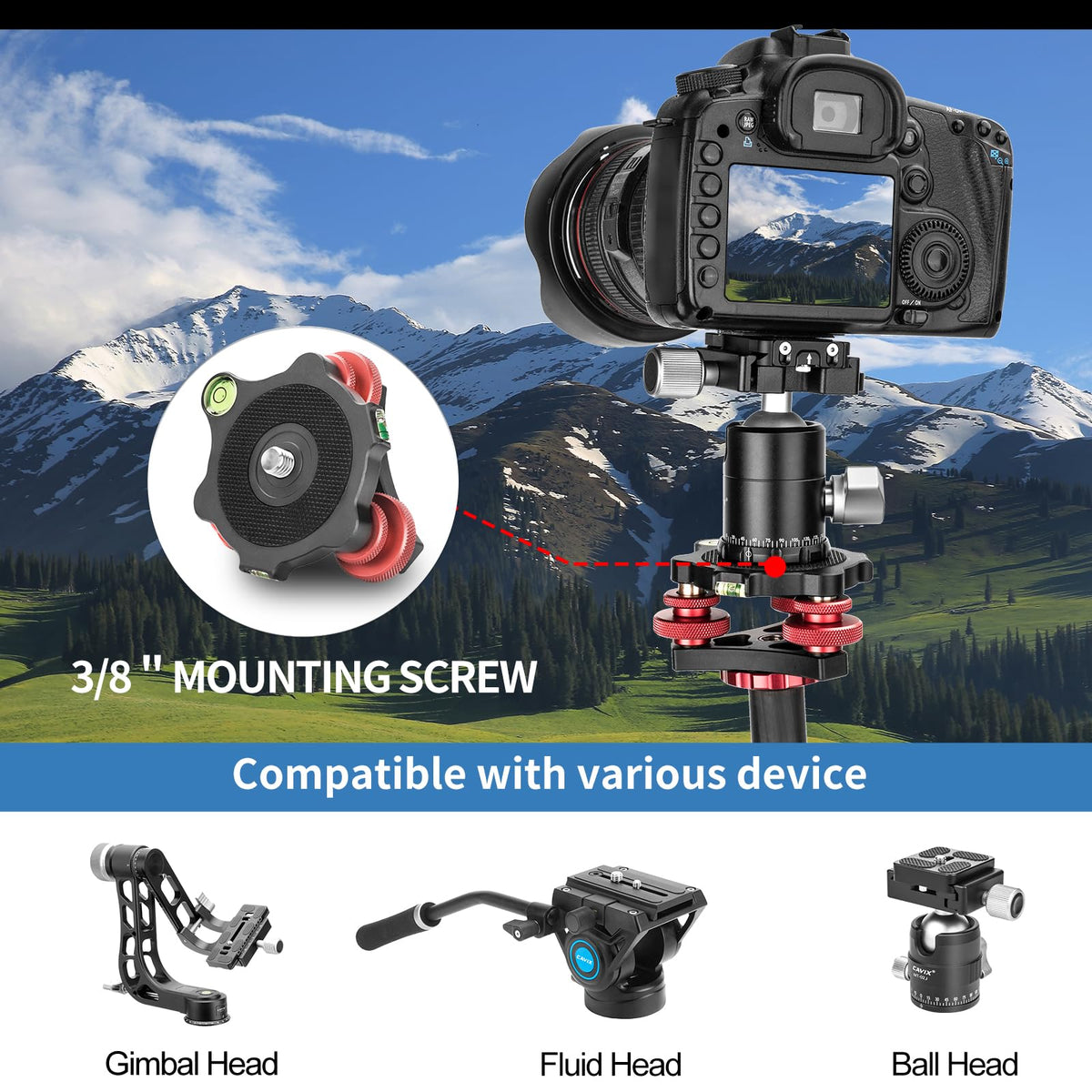 Cavix Lp-64 Aluminium Leveler With 3 Adjustment Dials And Bubble Level For Panoramic Head, Ball Head, Video Head And Tripod. It Is One Of Professional Photography Accessories. Widely-Used For Precise Leveling In Portrait Video Shooting. Designed With 3/8'' Male Top Stud And 3/8'' Female Bottom Socket. Compatible With Various Kinds Of Tripods Features: ?All Metal Construction, The Main Part Is Made Of Lightweight Aircraft-Grade Aluminium Material, Cnc Processing, Hard-Anodized Anti-Oxidation Treatment With The Surface. ?The Leveler Leveling Base Is Fitted Between Tripod And Head And Is Used In Combination With Tripods That Don'T Have Built-In Levelling Mechanisms. ?The Three Adjustment Dials Enable The Operator To Make Fine, Fingertip Adjustments Up To +/- 10 Degrees To Ensure The Camera Is Perfectly Level. ?The Dials Also Have Locking Rings To Ensure Stability Once The Right Position Is Reached. ?Manually Adjusted Level Makes For Smooth Photos And Thus Easier Stitching For Panoramic Photography. ?The Top Thread Mount Is 3/8'' With A Anti-Slip Rubber Pads, And The Bottom Thread Mount Is 3/8''. Specifications: ?Model: Lp-64 ?Material: Aircraft-Grade Aluminium ?Attachment Thread: 3/8'' ?Mounting Thread:3/8'' ?Length: 3.58''/91Mm ?Height: 1.65''/42Mm ?Diameter: 2.67''/68Mm ?Max Load: 20Kg(44 Lb) ?Maximum Height: 1.9''/48 Mm ?Minimum Height: 4.57''/40 Mm ?Adjusting Angle: +/- 5 Degree ?Net Weight: 0.44 Pound/0.2 Kilograms Packaging List: ?1*Lp-64 Camera Leveler