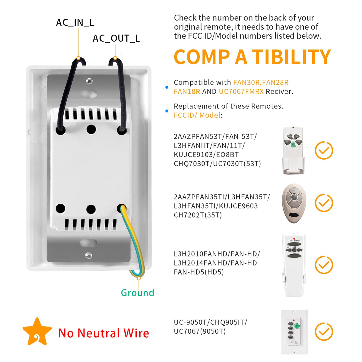 Humpptom Universal Ceiling Fan & Light Remote Control, 3 Fan Speed, Light Dimmer, Ceiling Fan Wall Switch Uc9050T And Receiver With A Hand Held Remote (Wired Transmitter & Receiver With A Remote) Uc9050T Ceiling Fan Wall Remote Control Compatible With Hampton Bay Harbor Breeze Hunter