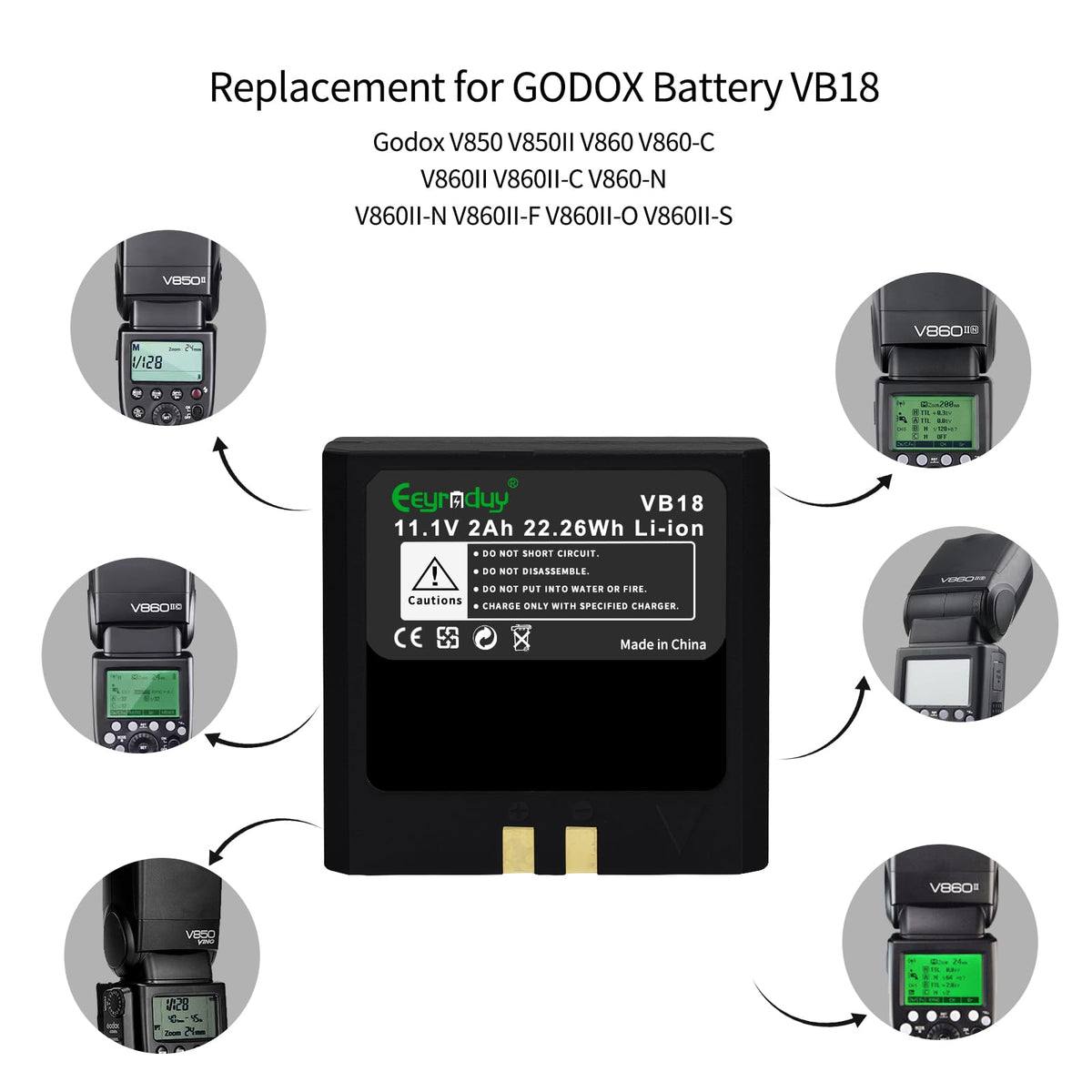 Q: What cameras are compatible with the Eeyrnduy VB18 rechargeable lithium battery?A: The Eeyrnduy VB18 rechargeable lithium battery is compatible with a range of Godox Speedlite flashes, including the V850, V850II, V860, V860C, V860II, V860II-C, V860N, V860II-N, V860II-F, V860II-O, and V860II-S models.