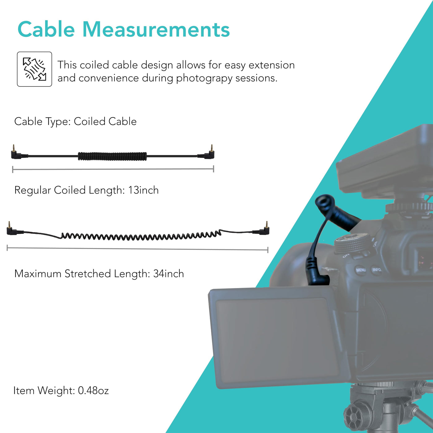 Q: What is the length and design of the Foto&Tech shutter release cable?A: The cable features a stretchable, spiral coiled design that measures 13 inches when coiled and can stretch up to approximately 34 inches, making it easy to use and carry while providing flexibility during shooting.