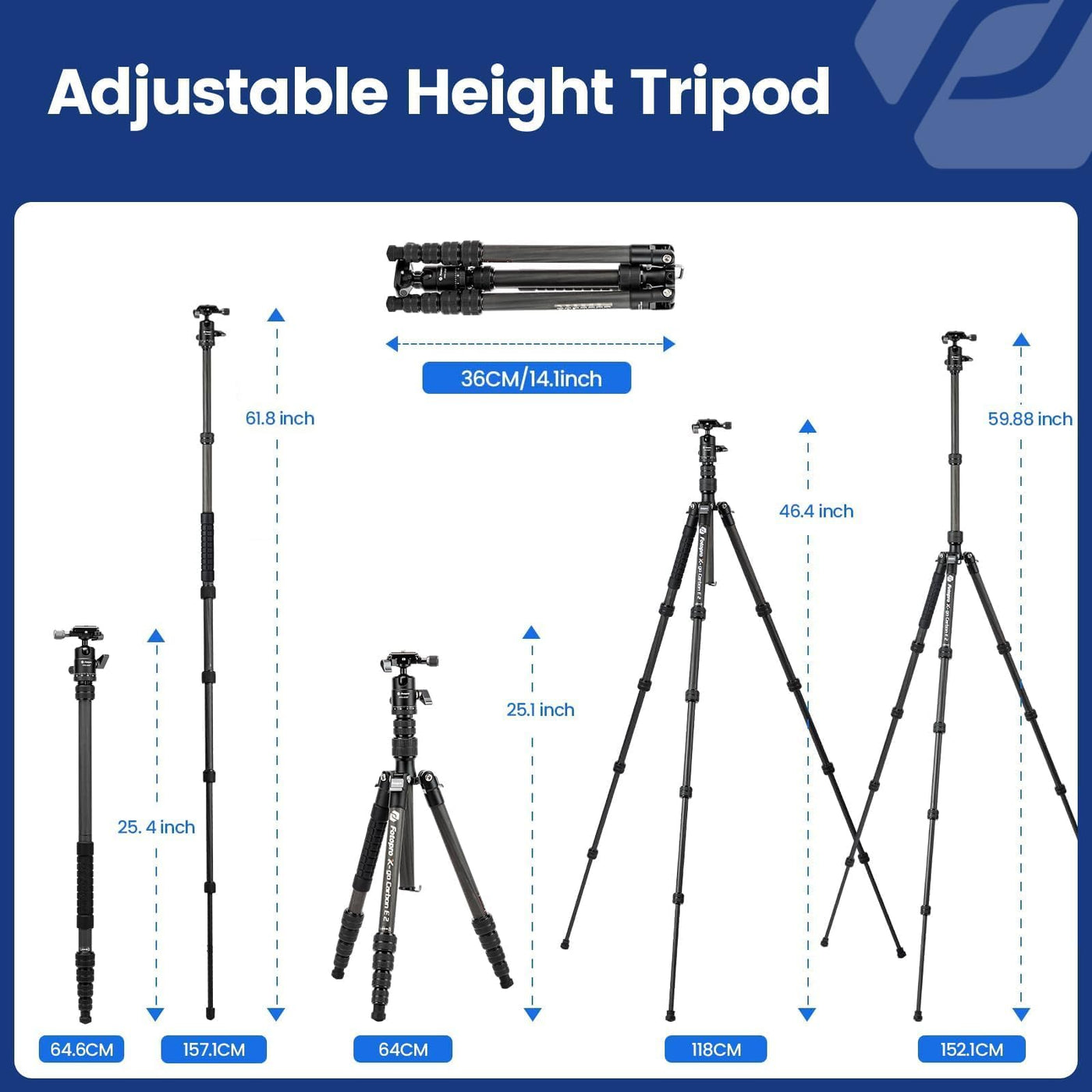 Compact And Portable, This Carbon Fiber Camera Tripod Weighs Just 0.98Kg/2.16Lbs Yet Supports Up To 8Kg/17.6Lbs, Ideal For Outdoor Photography. It Swiftly Converts Into A Monopod With Two Setups, Reaching Heights Of 108.5Cm/42.7 Inches Or 157Cm/61 Inches. Adjustable Leg Angles And Height (34Cm To 152Cm) Provide Stability On Uneven Terrain. Its 360 Ball Head Enables Smooth Panoramic Shots, While Non-Slip Rubber And A Detachable Weight Hook Enhance Stability. With A Folded Size Of 14.17 Inches/36Cm And A Carry Bag, It'S Perfect For On-The-Go Shooting.
