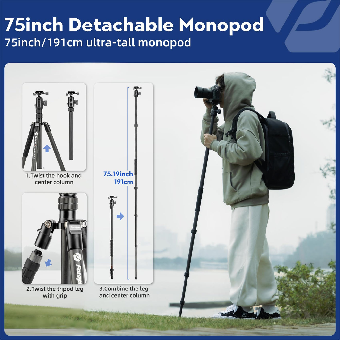 Fotopro 73'' Carbon Fiber Tripod For Camera, Compact Travel Tripod With Ball Head, Detachable Monopod With Quick Release Plate A