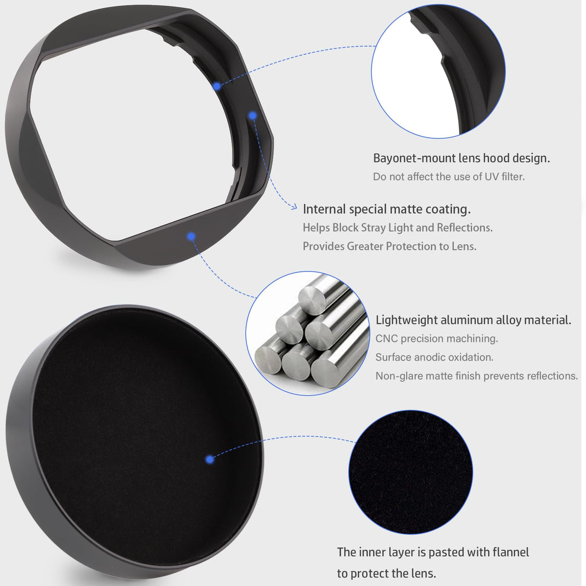 Q: How does the lens hood improve image quality?A: The lens hood helps block stray light and reflections, which minimizes lens flare and ghosting. This results in improved contrast and overall image quality when shooting.
