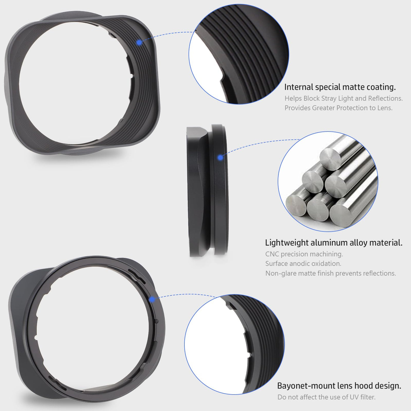 Q: How does the lens hood improve image quality?A: The lens hood helps block stray light and reflections, which reduces lens flare and enhances contrast, ultimately improving the overall image quality.