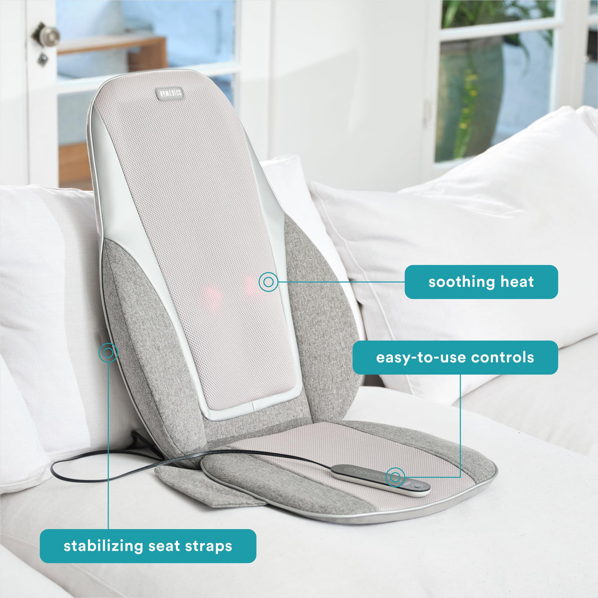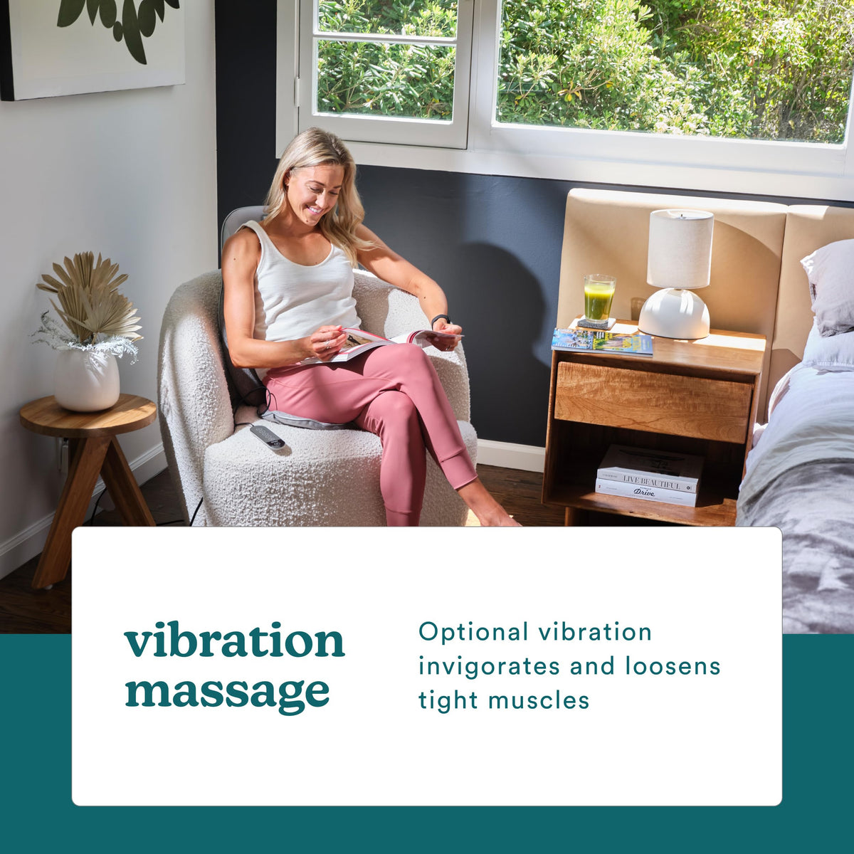 Deep-Kneading Shiatsu Massage: Massage Nodes Dig Deep As They Travel Up And Down Your Back To Soothe Stiff And Aching Muscles; Soothing Heat Offers Added Relaxation | Vibration Massage: The Shiatsu Plus Kneading And Vibration Massage Cushion With Heat Loosens Tight Lumbar Muscles With Optional Vibration Massage For Ultimate Relief | 3 Massage Zones: Use The Convenient Handheld Controller To Easily Target Your Upper, Lower, Or Full Back For A Custom Massage | Thoughtful Design: Integrated Strapping System Allows You To Use The Massage Cushion On Almost Any Chair Or Seat; Premium Upholstered Fabric And Metallic Detailing Offer Optimal Comfort And Added Luxury | What
