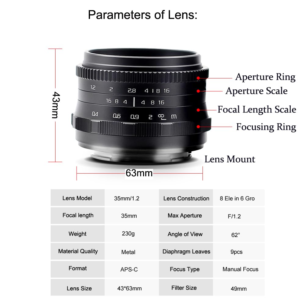 Q: How does the large aperture of F1.2 benefit photography?A: The F1.2 maximum aperture of the JINTU lens allows for exceptional performance in low-light conditions, enabling faster shutter speeds and greater control over depth of field. This results in beautiful bokeh effects and the ability to isolate subjects against soft backgrounds.