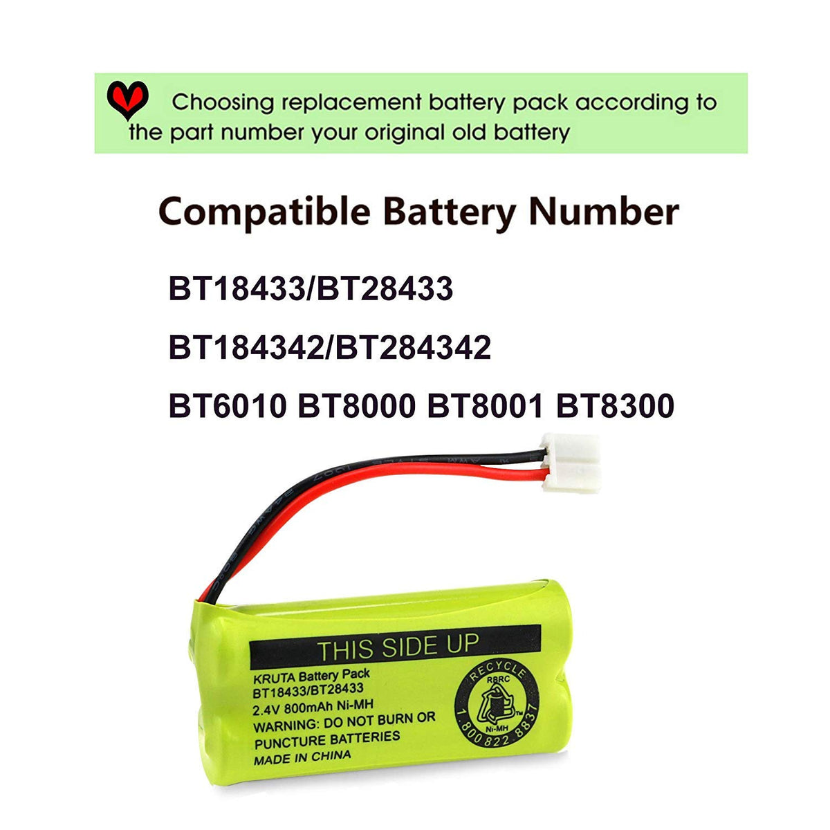 - Q: Is the Kruta BT18433/BT28433 battery safe to use? A: Yes, the Kruta BT18433/BT28433 battery is manufactured under strict safety standards. However, it's important to use it as directed and to only charge it with the appropriate charger for your cordless phone.