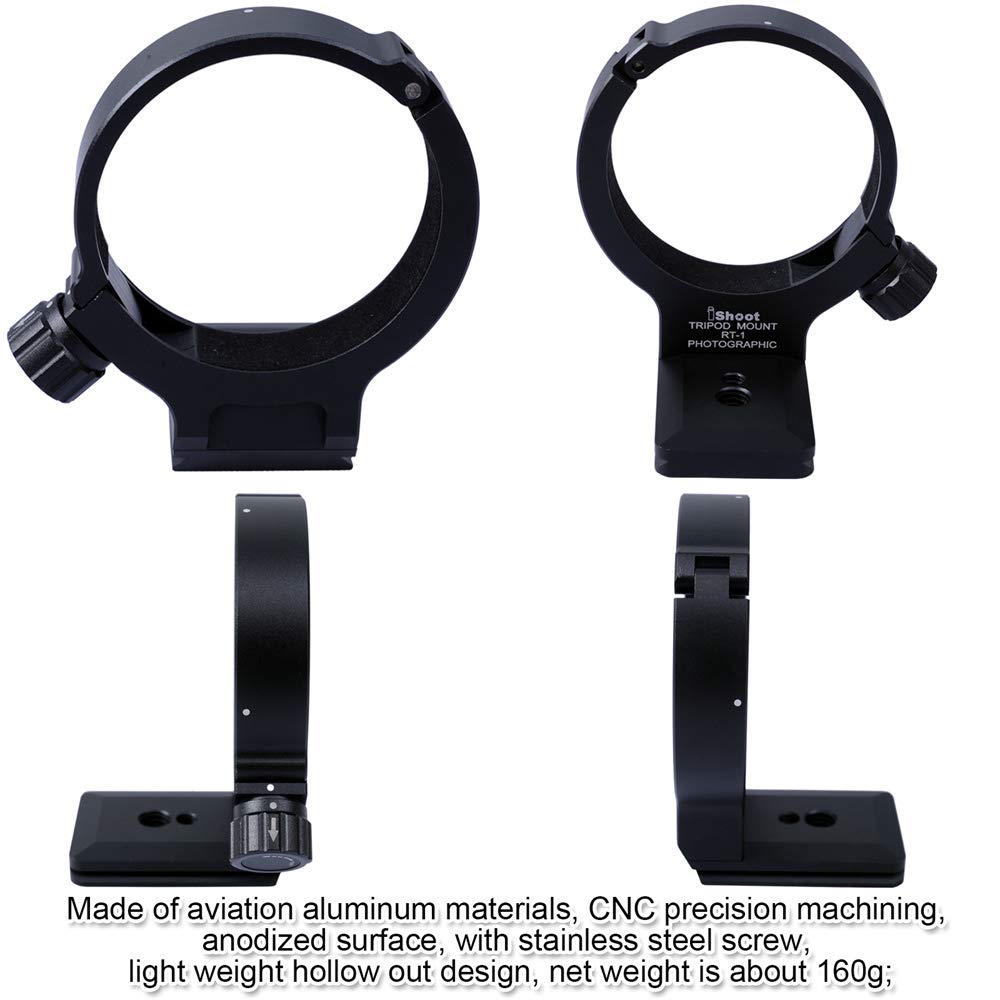 Lens Collar Support Tripod Mount Ring For Nikon Rt-1 Nikkor Af-S 300Mm F/4E Pf Ed Vr And Af-S 70-200Mm F/4G Ed Vr-Bottom Quick Release Plate Feature Compatible With Arca-Swiss 39Mm Fit Ball Headmain Features:1. Made Of Aviation Aluminum Materials, Cnc Precision Machining, Anodized Surface, With Stainless Steel Screw, Light Weight Hollow Out Design, Net Weight Is About 160G; 2.Referring To And Modified From Nikon Original Standard Design, Structure Is Enhanced, Details Are Improved, And Add The Function Of Quick Release Plate, More Practical; 3. Tripod Mount Rings Inner Diameter Is About 68Mm, Using Embedded Flocking To Increase Contact Surface; With Three Marks, Convenient For Lens Rotation And Alignment; Fast Spring Lock, Convenient For Quick Assembly And Disassembly Or Adjust Camera Body For Composition; Removable Quick Release Plate Structure, Reserved 1/4'' And 3/8 '' Screw Holes;4. Suitable For Nikon Af-S 300Mm F/4E Pf Ed Vr And Af-S 70-200Mm F / 4G Ed Vr Lenses;5. Quick Release Plate Is As 39Mm Standard, Compatible With Arca-Swiss / Kirk / Wimberley / Markins / Sunwayfoto / Kangrinpoche / Benro / Sirui / Marsace / Ishoot Ball Head Of Arca 39Mm Fit, Suitable For Is-Jz30 / Is-Jz50 / Is- Jz64 / Is-Qj58 / Is-Qj64 / Is-Jz60Bk / Is-Jz70Mft / Is-Jz80Bk.Package Includes: : 1 X Ishoot Tripod Mount Ring Is-Rt1 (Note: The Other Items In The Photos Not Listed Here Are For Illustrating Only, Not Included)