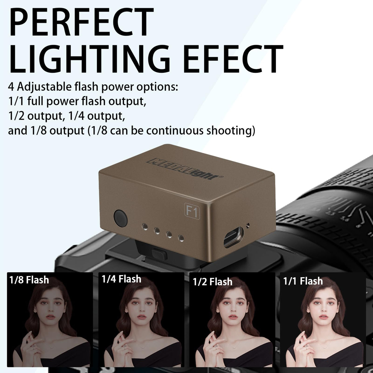 Q: What are the adjustable power options available on the MEDALight F1?A: The MEDALight F1 Mini Camera Flash offers four adjustable power settings: full power, 1/2 output, 1/4 output, and 1/8 output. The 1/8 output is particularly useful for continuous shooting, providing versatility for various photography needs.