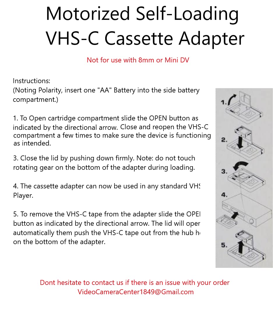 The Vcc Motorized Vhs-C To Vhs Cassette Adapter Is The Perfect Solution For Watching Home Movies Recorded On Vhs-C Or Super Vhs-C Tapes Using A Standard Vhs Vcr. With This Adapter, You�Ll No Longer Need To Hassle With Connecting Cables From Your Camcorder To Your Tv. The Motorized Mechanism Ensures Easy Entry And Removal Of Tapes, Providing A Smooth And Effortless Viewing Experience. Made From A Blend Of Durable Metal And Plastic, It�S Built To Last. Simply Insert Your Vhs-C Tape And Place The Adapter In Your Vcr, And You�Re Ready To Go. It Requires One Aa Battery (Not Included) To Power The Motorized System. This Adapter Is Compatible Only With Vhs-C And Super Vhs-C Tapes And Does Not Work With Or Play Minidv, Hi8, Digital 8, Or 8Mm Tapes. Enjoy The Convenience Of Reliving Your Memories With This Easy-To-Use Adapter, Backed By A 6-Month Warranty From Video Camera Center.