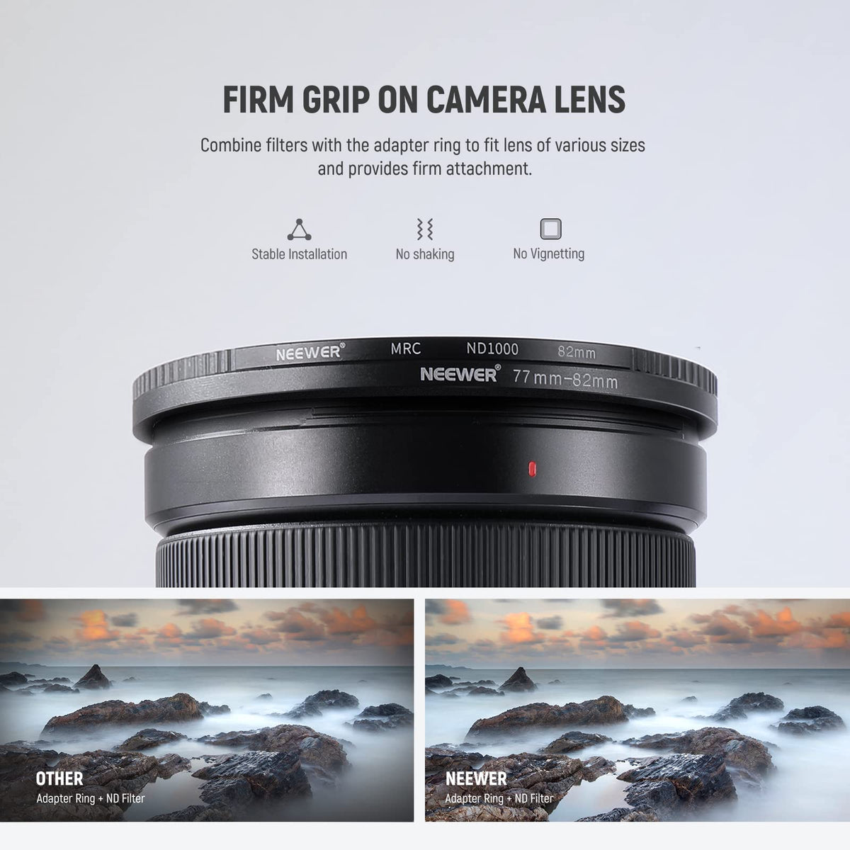 Description:Neewer Step-Up Filter Adapter Ring Set Can Easily Screw Onto The Front Of Any Lens, And Convert The Thread Size Of Your Lens To The Thread Size Of Any Other Accessory (Such As Filters, Hoods, Flashes And Lens Converters).Note:1.The First Number Is Always The Lens Thread Size, The Second Number Is The Filter Size Of The Accessory. If The First Number Is Bigger, It'S A Step-Down Ring. If The First Number Is Smaller, It'S A Step-Up.2.Give You The Ability To Connect Screw-In Filters To Different Size Lenses. For Instance, You Can Connect A 72Mm Filter To A 67Mm Lens By Placing The 67-72Mm Ring On The Lens And Then Screw The Filter Onto The Step-Up Ring.3.Please Verify Your Camera'S Lens Thread Size. Your Camera'S Lens Thread Size Will Be Marked Somewhere On The Lens Barrel Or Printed Underneath Your Lens Cap. This Number Is Always Preceded By A '''' (Diameter) Symbol. For Example: 37 = 37Mm Lens Thread Size.Specifications:Material: Anodized Aluminumcolor: Blackpackage Contents:1*49-52Mm Step-Up Ring1*52-55Mm Step-Up Ring1*55-58Mm Step-Up Ring1*58-62Mm Step-Up Ring1*62-67Mm Step-Up Ring1*67-72Mm Step-Up Ring1*72-77Mm Step-Up Ring1*77-82Mm Step-Up Ring