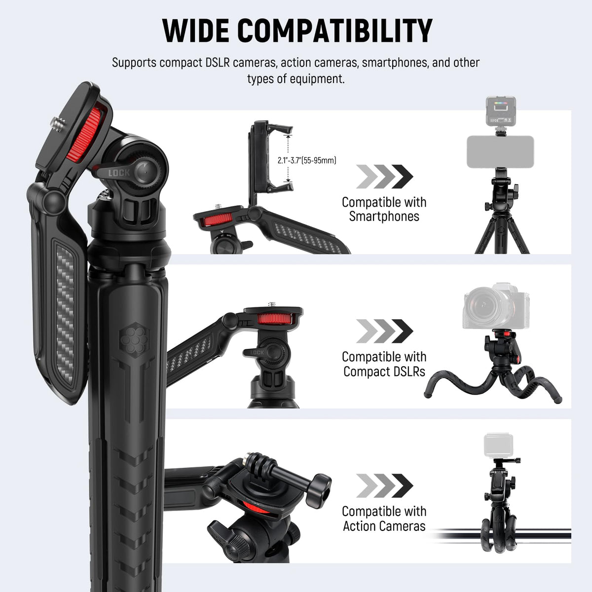 Introducing The Neewer Tp36, A Versatile Camera Tripod That Works As A Desktop Tripod Or A Portable Handgrip For Portraits, Selfies, Vlogging, Live Streaming, Video Recording, And Filmmaking. With A Standard 1/4 Screw For Perfect Compatibility With All Types Of Compact Cameras. Its Flexible Design Allows Secure Mounting On Posts, Branches, Or Handlebars. The Included Bluetooth Remote Ensures Hands Free Triggering Up To =33Ft/10M Away. Pan The Tripod Head 360 Or Tilt It Between -90 And 75 For Panoramic, Overhead, And Vertical Shots. Keep It Stable With Screw Knobs And A Bubble Level. The Handle Also Converts Into A Phone Holder, Compatible With Iphone 15 Pro Max 14 13 12 Pro Max Mini Samsung Galaxy S23 S22 Ultra Note Google Pixel 8 7 Pro Huawei P60 Mate60 Pro, Etc. Use The Included Action Camera Adapter For Dual Device Shooting, Compatible With Gopro Hero 12 11 10 Dji Osmo Action 4 3 2 Insta360 X3 X2 Action Cameras. The Cold Shoe Mount On The Phone Holder Can Attach Fill Lights Or Microphones To Enhance Mobile Photography. Specifications Model: Tp36 Item Type: Flexible Tripod Compatibility: Phones & Action Cameras Application: Photo & Video Main Features: 2 In 1 Handle & Phone Holder Mounting Points: 1/4'' Screw Main Material: Aluminum Alloy, Abs Load Capacity: 4.4Lb/2Kg Dimensions: 11.6''X2.95''X2.8''/295X75X70Mm Weight: 13.4Oz/380G Package Contents 1 X Flexible Tripod With Handle & Phone Holder 1 X Action Camera Mount Adapter 1 X Bluetooth Remote 1 X User Manual