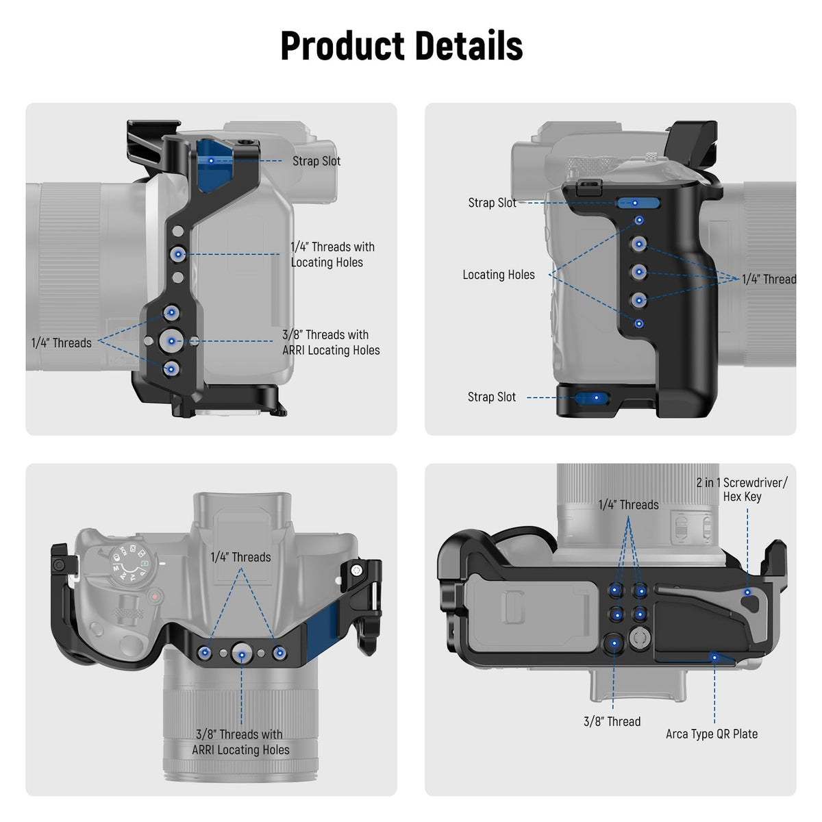 Compatible With Canon Eos R50 Camera, This Aluminum Alloy Camera Cage Manufactured With Highly Precise Cnc Machining Is Durable And Formfitting-Giving Your Camera An Extra Shield Along With Abundant Mounting Points For Connecting Various Accessories, Including Top Handles, Monitors, And Microphones. The Base Is Compatible With Arca Quick Release Mounting System, Which Means You Can Move The Camera From A Gimbal To A Tripod Or Fluid Head In Just A Few Seconds. The 1/4'''' Mounting Screws And Two Anti Twist Pins Can Firmly Lock Your Camera And Prevent It From Deflecting. The Nonslip Rubber Pad Will Protect The Camera From Scratches, And A Small Magnetic Dual Headed Wrench Helps You Finish The Installation Process With Minimal Effort. Specifications Model: Ca031 Material: Aluminum Alloy, Stainless Steel, Rubber Dimensions: 5.3'''' X 3.9'''' X 2.1''''/134.2 X 98.5 X 54.5Mm Weight: 5.4Oz/153G Package Contents 1 X Camera Cage For Eos R50