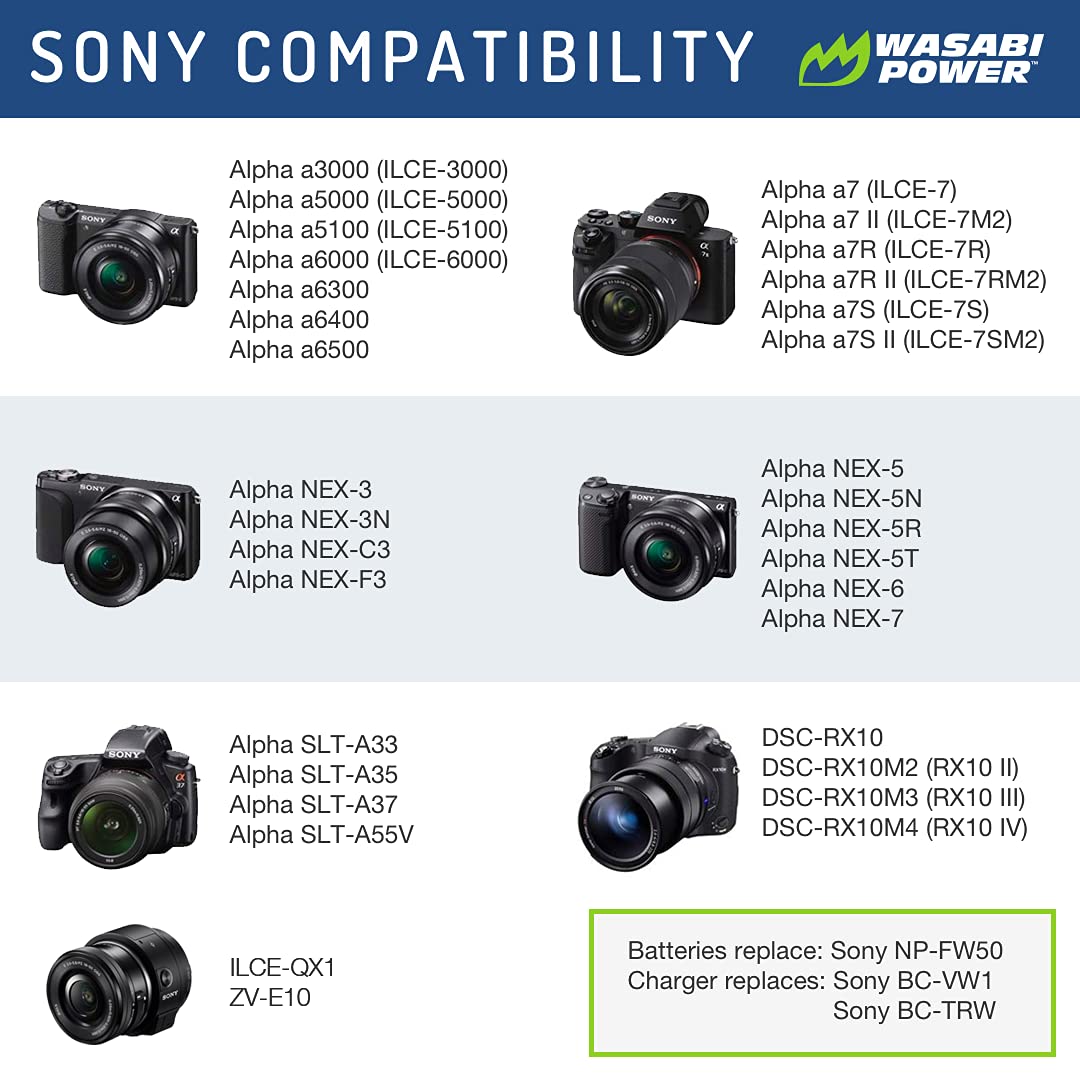 The Wasabi Power Fw50 Battery Replaces The Sony Np-Fw50 Battery. It Features 1300Mah To Provide A Longer Run-Time Between Charges. It Is Made With Premium Grade-A Cells To Provide Maximum Battery Life. Includes 2 Batteries With A 3-Year Manufacturer Warranty. Additionally, The Wasabi Power Fw50 Is Completely Compatible With All Sony Original Equipment Including The Sony Charger. Need Sony Alpha A6500 Batteries? Wasabi Power Is A Great Replacement!Compatible With The Following Sony Models: Alpha A7 (Ilce-7)Alpha A7 Ii (Ilce-7M2) Alpha A7R (Ilce-7R) Alpha A7R Ii (Ilce-7Rm2) Alpha A7S (Ilce-7S) Alpha A7S Ii (Ilce-7Sm2) Alpha A3000 (Ilce-3000) Alpha A5000 (Ilce-5000) Alpha A5100 (Ilce-5100) Alpha A6000 (Ilce-6000 / Ilce-6000L / Ilce-6000Y) Alpha A6100 (Ilce-6100 / Ilce-6100L / Ilce-6100Y) Alpha A6300 (Ilce-6300 / Ilce-6300L / Ilce-6300M) Alpha A6400 (Ilce-6400 / Ilce-6400L / Ilce-6400M) Alpha A6500 (Ilce-6500 / Ilce-6500Kit / Ilce-6500M) Alpha Nex-3 Alpha Nex-3N Alpha Nex-5 Alpha Nex-5N Alpha Nex-5Ralpha Nex-5T Alpha Nex-6 Alpha Nex-7 Alpha Nex-C3 Alpha Nex-F3 Alpha Slt-A33Alpha Slt-A35 Alpha Slt-A37 Alpha Slt-A55V Cyber-Shot Dsc-Rx10 Cyber-Shot Dsc-Rx10M2 (Rx10 Ii) Cyber-Shot Dsc-Rx10M3 (Rx10 Iii) Cyber-Shot Dsc-Rx10M4 (Rx10Iv) Ilce-Qx1Zv-E10