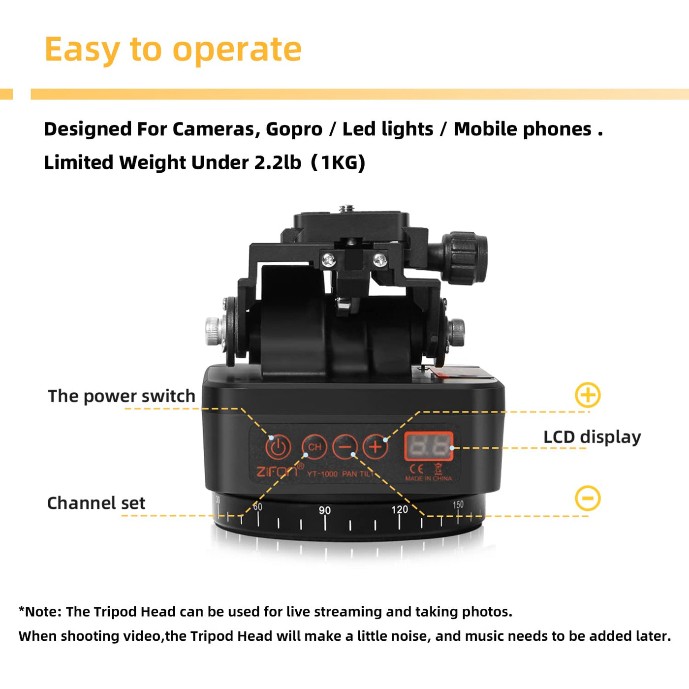 ?Motorized Pan Tilt Head?Use The Remote Control To Adjust The 360 Horizontal Rotation And 35 Vertical Rotation Of The Pan Tilt, There Are Available In 8 Speeds, For Both Indoor & Outdoor Professional Shooting.