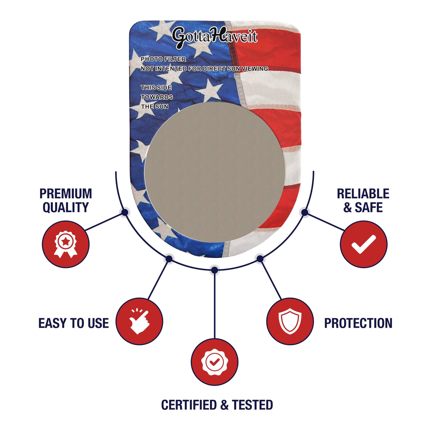 Introducing The Gottahaveit Smartphone Photo Filter - A Practical Tool For Capturing Solar Events With Precision. This Optimized Filter Ensures That Each Stage, From Partial Phases To Totality, Is Preserved In Your Photographs. For Those Wanting To Capture The Sun'S Moments, The Gottahaveit Smartphone Photo Filter Is Tailored For Solar Eclipse Photography On Your Phone. Enhance Your Photography Experience And Capture Celestial Phenomena With Clarity. Our Photo Lens Filter Is More Than Just Protection - It Shields Your Phone Or Camera Lens. Snap Confidently, Knowing Your Device Is Guarded Against The Sun'S Brightness. Simple And Effective, Our User-Friendly Photo Filter Requires No Fuss. Just Hold It In Front Of Your Smartphone Lens, Align The Correct Side With The Sun, And Capture Moments Effortlessly. Save The Date For April 8Th, 2024 - A Total Solar Eclipse Is Approaching. Immerse Yourself In The Moment, Armed With Our Advanced Photo Filters To Capture Memories Authentically. A Crucial Reminder: These Photo Filters Aren'T For Direct Sun Viewing. They'Re Tools For Photography, Not Eye Protection. Prioritize Safety - Staring Directly At The Sun, Even During An Eclipse, Without Proper Eye Protection Can Lead To Severe Injury. Your Safety Is Important To Us.