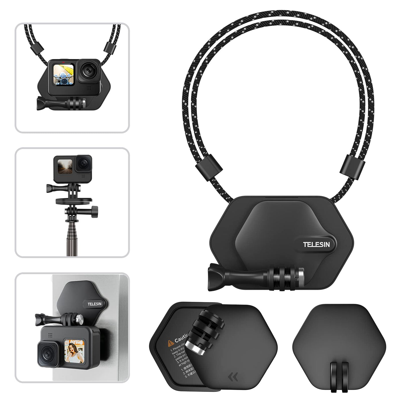 Telesin Magnetic Chest Mount + Neck Strap + Viscose Mount + Selfie Stick Quick Release Adapter Mount Base Multiple Function Body Mounting Kit There Are Some Notices Before Using This Mounting Kit 1.For The Nano Viscose Mount, Make Sure Follow The Arrow Direction To Pull Out The Cover And Mount It With Your Camera Or Phone. If You Have Problem With Operation, Read The Manual First Or Contact Our Customer Service For Help. 2.After Using The Nano Viscose For Several Times, Please Remember To Clean It With Fresh Water And Dry It, To Make Sure It Keep The Strong Sticker Function. 3.For The Quick Release Adapter Base Use On The Tripod Or Selfie Stick, Please Do Not Use It For Extreme Activities At High Speed Like Snowboarding, Because You May Hitting A Tree Or Other Obstacle And Bumping Off The Magnetic Mount Which Will Cause You To Lose Your Camera. 4.For The Magnetic Chest Mount, Please Make Sure You Wear The Appropriate Thickness Of Clothing To Ensure That The Magnet Force Of The Magnetic Bracket Is Strong And Solid Enough. 5.This Product Kit Includes Only One Locking Screw, When You Use The Magnetic Mount And Quick Release Adapter Base At The Same Time, You Will Need An Extra Locking Screw. 6.Make Sure To Clean And Dry The Surface Before Placing The Magnetic Mount And Nano Mount. Package Content 1 * Magnetic Front Plate 1 * Magnetic Base With Neck Strap 1 * Nano Viscose Mount 1 * Quick Release Adapter Base 1 * Locking Screw 1 * Protective Carry Bag Warranty If For Any Reason You Are Unhappy With Any Product By Telesin, Please Do Not Hesitate To Contact Our Online Customer Support For Help! We Take Full Ownership And Responsibility For The Quality Of Our Products And Will Do Our Very Best To Solve Your Problem Quickly And Efficiently!