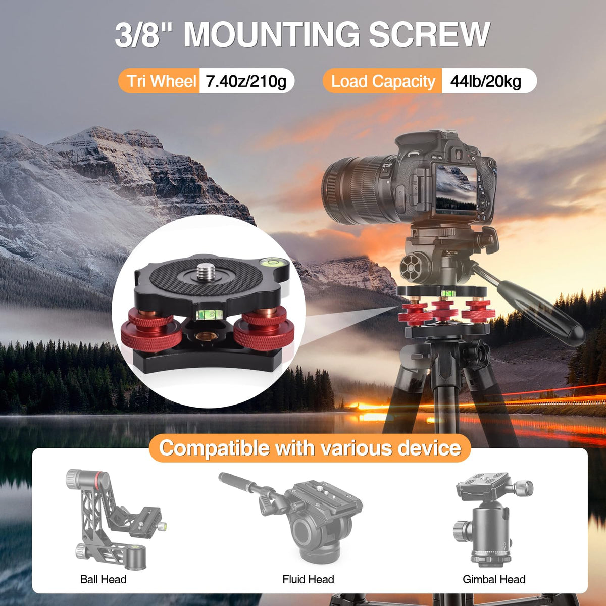 Camera Leveling Base With Tripod Head And Three Wheels. The Main Parts Are Made Of Lightweight Aerospace-Grade Aluminum, Processed By Cnc Machining, And Surface-Treated With Hard Anodizing. The Surface Is Smooth, Ensuring A Long Service Life. The Top Is Equipped With Rubber Pads To Prevent The Base From Sliding And Enhance Stability. It Is Designed With A 3/8-Inch Top Screw And 3/8-Inch Bottom Socket. ? Equipped With A 1/4-Inch To 3/8-Inch Bottom Adapter, It Can Attach The Leveling Base To Any Type Of Tripod, Compatible With Various Camera Photography Models, Monopods, And Sliders.