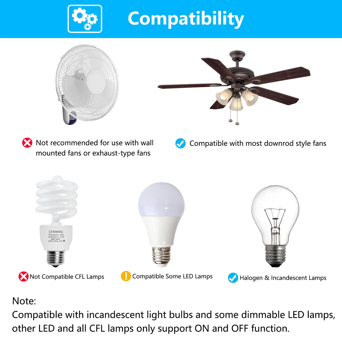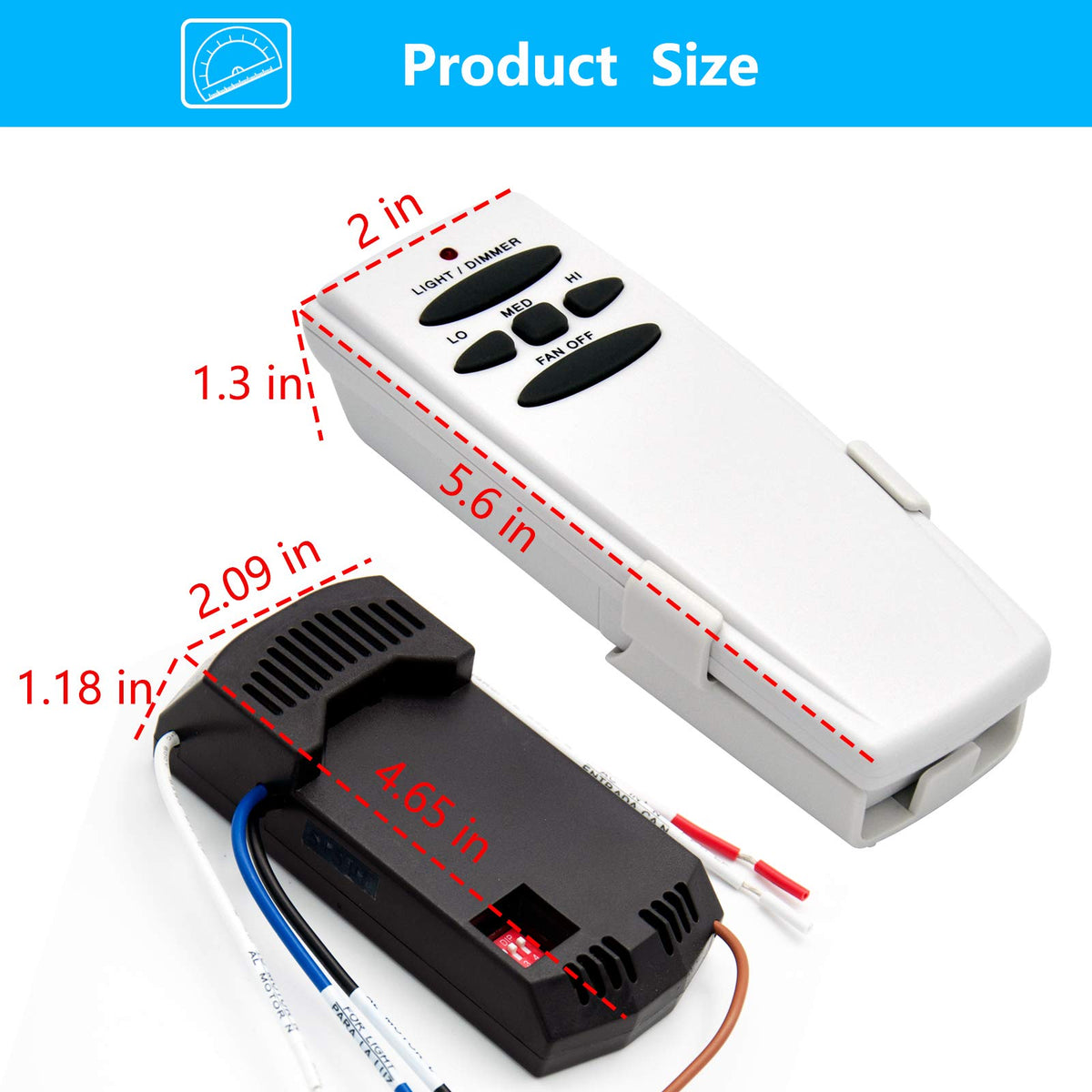Need To Know Before Buying This Ceiling Remote Control Kit Not Have The Function Of Reversal For The Fan. The Light Dimmer Is Compatible With Dimmable Led And Incandescent Light Bulbs, Non-Dimming Led Bulbs And Cfl Lights Only Have The On/Off Function. If Your Fan Have Pull Chain Switch, Before Using The Wireless Remote Control, Use The Switch To Turn The Fan Speed To Maximum And Turn The Fan Light On. In This Way The Switch And The Wireless Remote Control Can Be Used Together. Trouble Shooting Guide 1. Fails To Operate A. Power To Receiver? B. Receiver Wired Correctly? C. Fan Manual Speed Control In Highest Position? D. Light Kit Switch Turned On? E. Good Battery In The Transmitter? F. Code Set At Exact Same Positions In Both Transmitter And Receiver? 2. Won'T Operate At Distance If Transmitter Operates Fan/Light Kit When Up Close, But Not At 20 Feet Away. Try Placing The Brown Antenna Wire Higher, Up Through Ceiling/Outside The Junction Box. Package Included: 1 X Transmitter 1 X Receiver 6 X Plastic Wire Connector 2 X Screws 1 X Manual Notice ! Your Ceiling Fan And Light Kit Assembly Must Meet The Following Requirements: 1. Do Not Use With Solid State Fans. 2. Electrical Rating: 120V 60Hz 3.5A Max. Motor Amps: 1.0 Max. Light Watts: 240-(Incandescent Or Ballast Non-Dimmer)