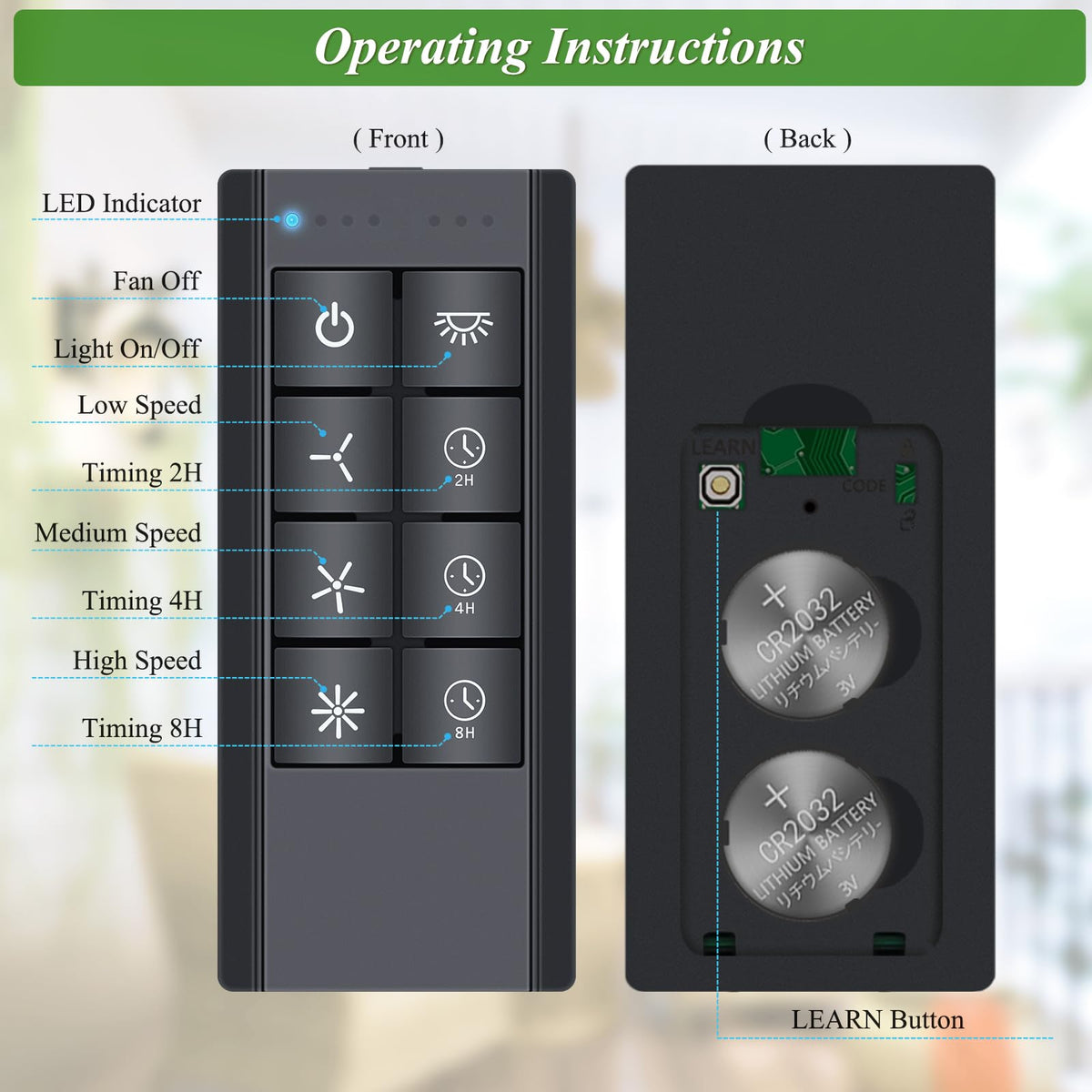 Smart Ceiling Fan Remote Control Kit With Light Dimmer 3 Speed Control & Timer Function The Smart Ceiling Fan Control Enables You To Adjust The Fan 3 Speed, Turn On/Off Light, And Time Schedule Settings. Make Your Life Easier And More Convenient. Rf Remote Control & Phone App Control Simply Adds This Smart Fan Controller To Your Ceiling Fan To Have It Wifi Enabled And Remote Controllable. Change Your Fan Speed Or Turn On/Off Light From Anywhere With Your Smartphone Or Included Rf Remote. Compatible With Alexa/ Google Assistant With Smart Life App, The Wifi Fan Controller Is Easy To Pair With The Alexa Or Google Assistant. Just Give Voice Command And Enjoy Hands-Free Control Over Your Home. Cautions: This Device Only Support 2.4Ghz Wifi, Don'T Support 5Ghz. Please Switch Your Wifi To 2.4Ghz Check The Dimension Of Receiver Carefully To Make Sure There Is Enough Space In The Canopy Of Your Fan Although The Receiver Is Really Small Size. If You Have Pull Chains Switch, Turn Pull Chains Switch To Max Speed Position And Turn Light On. Only In This Way You Can Get Correct Speed And Functions. Learn Key Button The Production Settings Of Remote Control Kit Have Been Configured And Can Be Used Directly. If It Fails To Work, Please Use The Learn Button To Re-Match. How To Set The Function Of Learning Button: 1. Disconnect The Receiver'S Power Cord And Connect It Again To Restart The Receiver. 2. Please Press The ''Study Button'' (It Is A Small Hole In The Battery Case, You Need To Use The Needle To Press It) Of The Remote Control Within 30 Seconds And Keep This Action For 3-5 Seconds. 3. If You Hear Your Receiver Making A Beeping Sound Or The Indicator Light Flashes A Few Times, The Match Is Successful.Package Includes1 X Remote Control1 X Receiver1 X Wall Mount6 X Wiring Cap 2 X Screw1 X User Manual