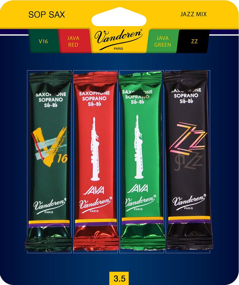 Vandoren Srmixs35 Soprano Sax Jazz Reed Mix Card Includes 1 Each Zz, V16, Java And Java Red Strength 3.5