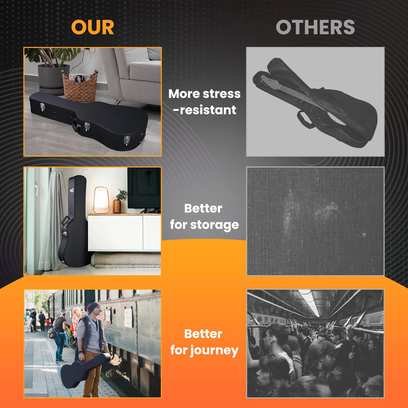 Features:- Specially Designed - 43 516 X 18 18 X 6 316 Dreadnought Acoustic Guitar Case Features Hard Plywood Construction For Better Protection And Is Specially Designed And Crafted To Fit 41 Dreadnought Acoustic Guitars Perfectly- Durability Protection - Sturdy Exterior Casing Is Made Of Hard Plywood Wrapped In Pu Leather For Long-Lasting Toughness And The Interior Is Made Of Molded Foam Lined With Plush Suede For Scratch Resistance And Shock Absorption- Stable Secure - Comes With Sturdy Chrome Locks And Bumpers On The Bottom And Sides Of The Case For Extra Protection Against The Potential Of Damage, Intrusion Or Falling Over During Travels- Highly Portable - Comfortable Molded Handle Makes It Portable And Easily Transported Around, Even With Its Relatively Large Size And Great Load Bearing Capacity- Extra Storage - With A Compartment In The Middle Of The Case For Easily Storing, Securing And Transporting The Important Accessories Needed To Go Along With Your Guitarspecifications:- Product Outer Dimension(Lxwxh): 43 516 X 18 18 X 6 316 (110 X 46 X 157 Cm)- Product Inner Dimension(Lxwxh): 41 34 X 15 1516 X 5 1116 (106 X 405 X 145 Cm)- Materials: Plywood, Molded Foam, Suede Liner, Pu Leather- Net Weight: 99 Lbs (45 Kg)Package Contents:- 1X Acoustic Guitar Wooden Case- 2X Keys- Package Content:- 1X Electric Guitar Wooden Case- 2X Keys