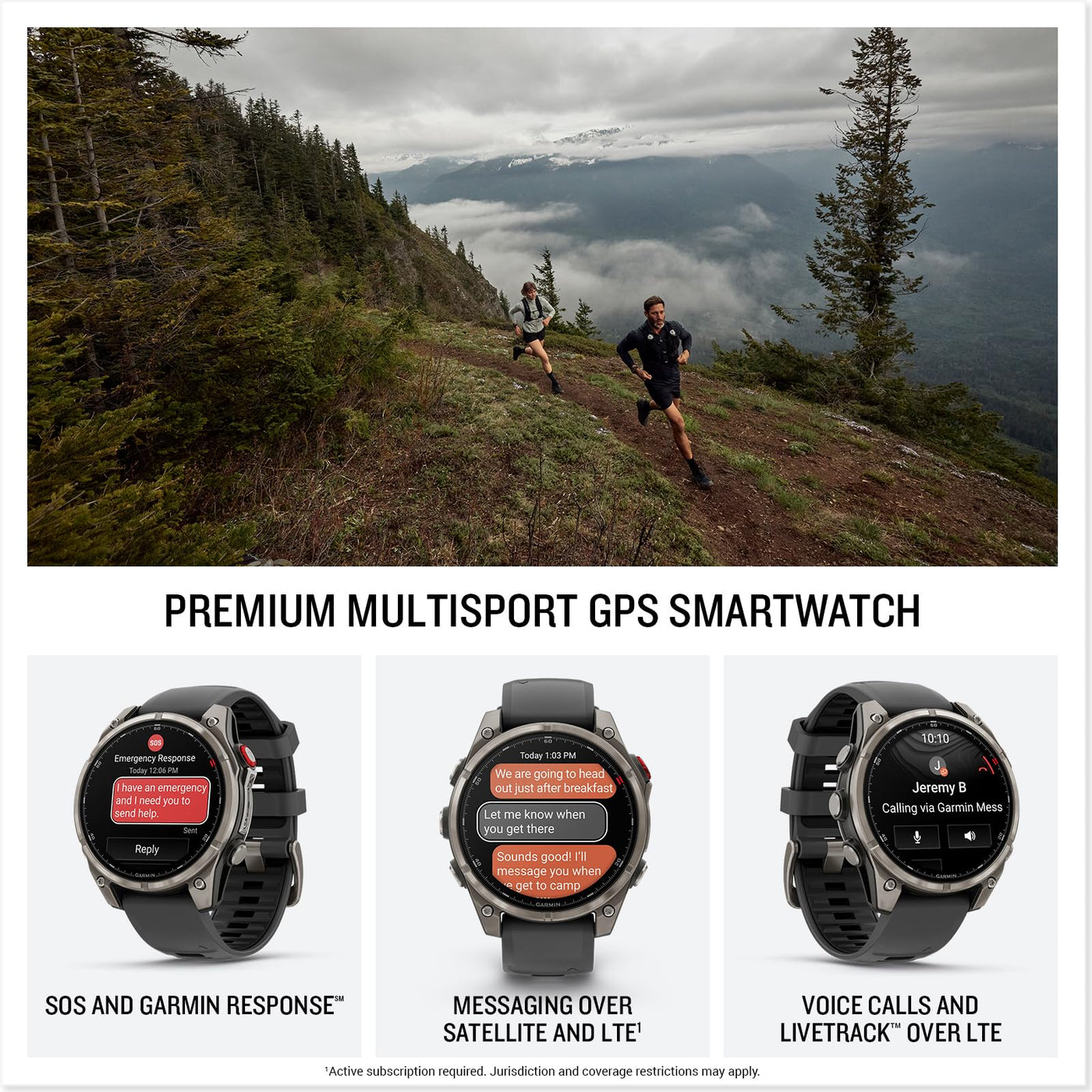 Multisport Gps Smartwatch With Built-In Inreach Technology For Two-Way Satellite And Lte Connectivity (Active Subscription Required; Coverage Limitations May Apply; Some Jurisdictions Regulate Or Prohibit The Use Of Satellite Communication Devices) | Rugged Design With A Bright 1.4 Amoled Touchscreen Display, Titanium Bezel, Scratch-Resistant Sapphire Lens And Other Premium Materials | In An Emergency, Inreach Satellite Technology Allows You To Trigger An Interactive Sos Message To The Garmin Responsesm Coordination Center For 24/7 Assistance (Active Subscription Required; Coverage Limitations May Apply; Some Jurisdictions Regulate Or Prohibit The Use Of Satellite Communication Devices) | Lte Network Connectivity Lets You Leave Your Phone Behind; Use Your Watch To Exchange Messages And Make Voice Calls - Plus Let Friends Follow Along With Livetrack Location Sharing (30-Second Update Rate) And Location Check-Ins With The On-Device Garmin Messenger App (Active Subscription Required; Coverage Limitations May Apply) | Inreach Technology Allows You To Send Messages And Get Location Check-Ins Over Satellite When Taking On An Off-Grid Adventure (Active Subscription Required; Coverage Limitations May Apply; Some Jurisdictions Regulate Or Prohibit The Use Of Satellite Communication Devices) | Navigate By Using Preloaded Topoactive Maps With Relief Shading - Plus Built-In Maps For Golf Courses And Ski Resorts Worldwide | Advanced Training Features, Performance Metrics And Training Plans For Sports Enthusiasts And Cross-Training Athletes | 24/7 Health And Wellness Monitoring With Wrist-Based Heart Rate, Advanced Sleep Monitoring, Hrv Status, Ecg App, Pulse Ox And More (This Is Not A Medical Device, And Data Presented Is Intended To Be A Close Estimation Of Metrics Tracked; Pulse Ox Not Available In All Countries) | Built-In Led Flashlight Offers Convenient Illumination When You Need It, Whether Trail Running At Dusk Or Getting Around The House At Night | 40-Meter Dive Rating And Leakproof Metal Buttons Let You Reach New Depths With Support For Scuba And Apnea Dive Activities