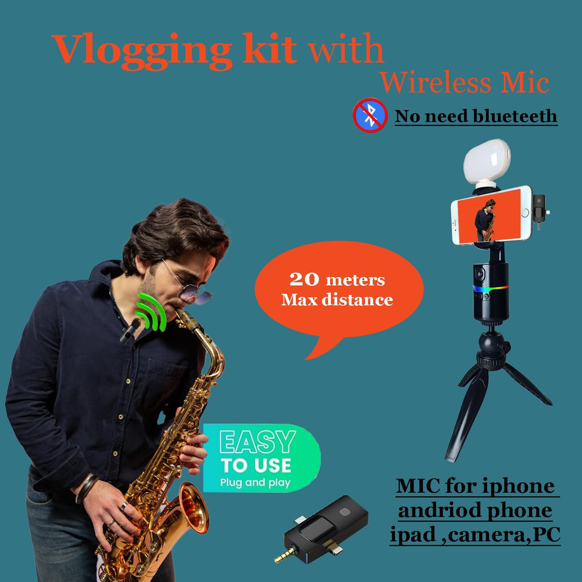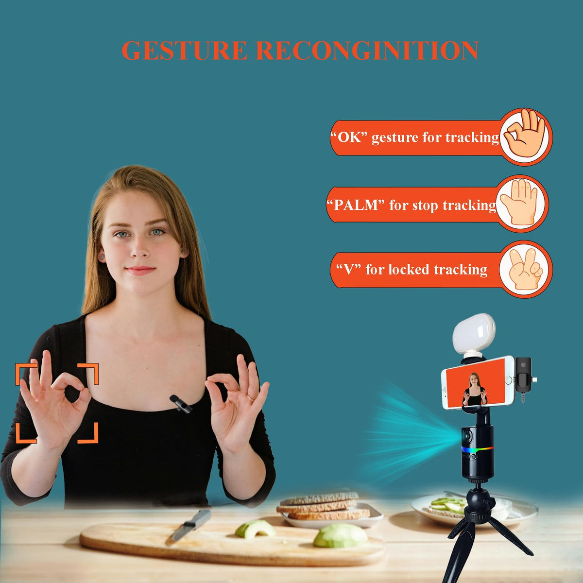 1. Smart Face Tracking & Gesture Control This Smart Face Tracking Phone Holder Uses Advanced Ai To Automatically Detect And Track Your Face, Keeping You Perfectly Framed In Every Shot. Control Recording Hands-Free With Intuitive Gestures-Start With An ''Ok'' Sign, Stop With A Palm, And Lock Targets With A ''V'' Gesture. The Adjustable Camera Angle Ensures Smooth, Professional Vlogging. 2.Wireless Mic & Adjustable Tri-Color Lighting The Vlogging Kit Includes A Wireless Microphone With 20M Range For Crisp Audio, Even In Noisy Environments. Easy Use, Plug The Mic Transimitter And Open Them, Then It Connect And Work. No Need App. Enhance Visuals With The Built-In 3-Color Led Lights (White/Warm/Natural), Adjustable Via Short/Long Presses. Rechargeable Batteries Offer 1.5-8 Hours Of Runtime, Perfect For On-The-Go Creators. 3.360 Auto Rotation Tripod Double Click The Middle Button, The Product Will Automatically Rotate 360 Degrees And You Can Shoot A 360 Degree Panoramic Video. 4. Rgb Status Indicator Lights: Stay Informed With Rgb Indicator Lights: Red (Stop Tracking), Green (Active Tracking), And Blue (Tracking Without Gesture Reconition). 5.Versatile Mounting & Portable Design Use This Vlogging Kit For Iphone And Android Phone , Desk Tripod, Handheld Or Mounted On Other Tripods Via The 1/4 Screw Hole. The Compact Design Ensures Easy Portability For Travel Or Outdoor Shoots. It Is A Good Vlogging Kit For Dancing, Yoga, Teaching,Cook,Outdoor Activities, Live Steaming And So On. It Is A Good Equipment For Youtube,Tiktok, Facebook, Blog, Instagram And So On.