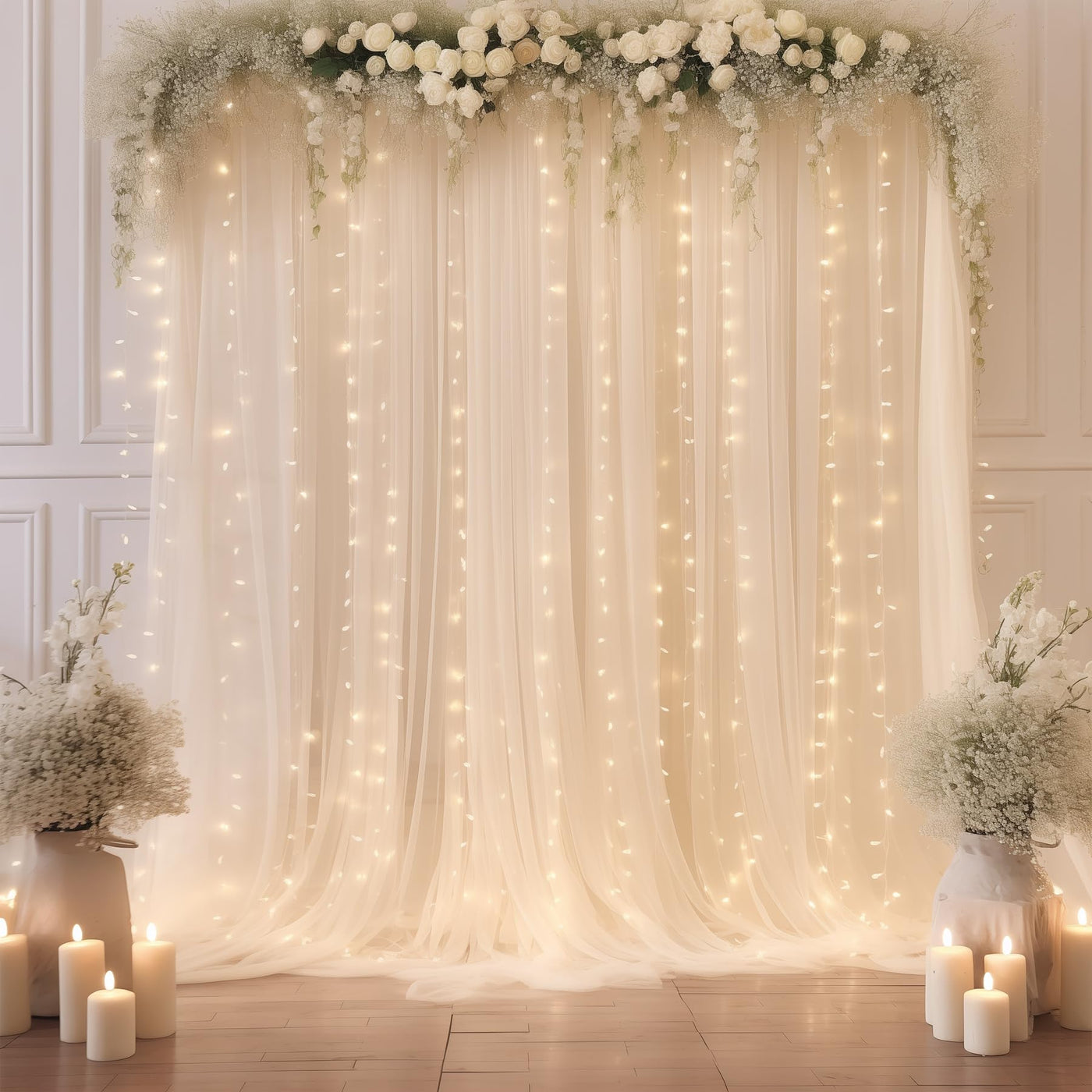 10 10Ft White Tulle Backdrop Curtain With Lights String For Parites, Sheer Curtain Backdrop Drapes For Wedding Party Home Decorations