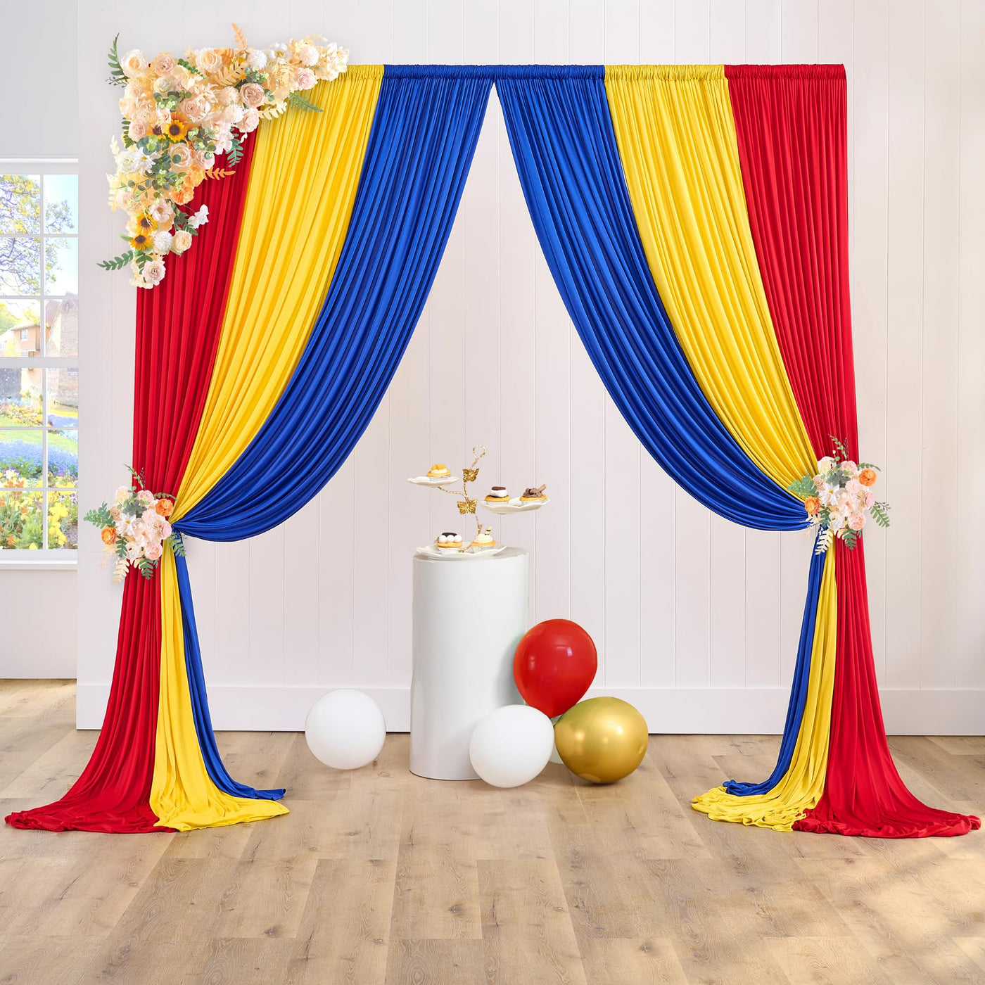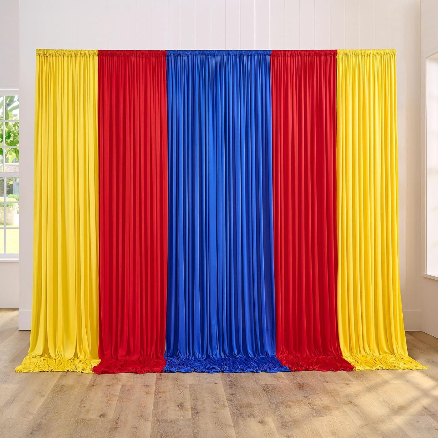 Q: What colors does this backdrop curtain come in?A: The backdrop curtain features a vibrant combination of Yellow, Red, and Royal Blue colors, making it suitable for various themed parties and events.