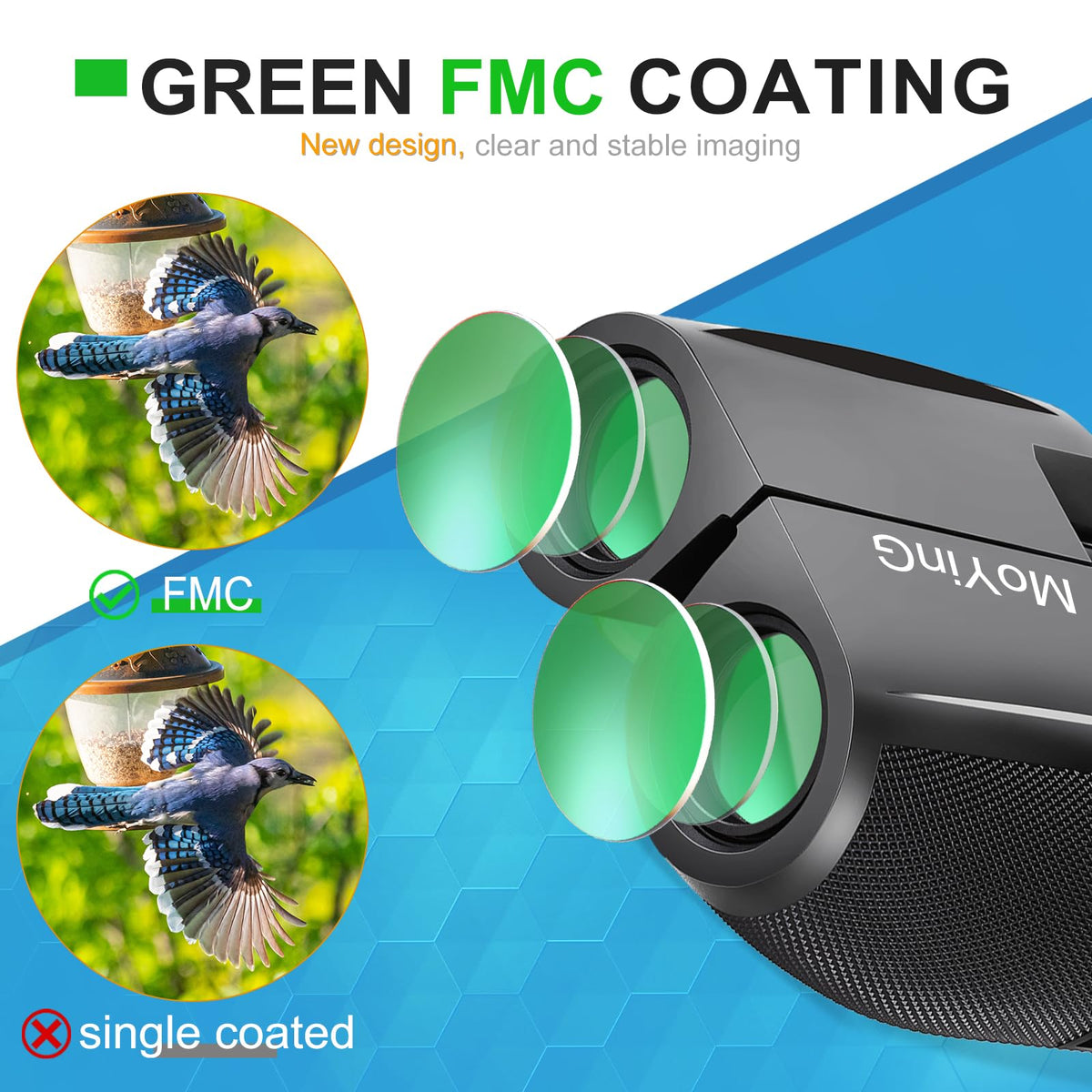 Q: Are these binoculars suitable for low light conditions?A: Yes, these binoculars are designed for low light vision. The BAK4 Porro Prism and green FMC anti-reflective coating enhance light transmission, providing excellent visibility even in dim lighting.