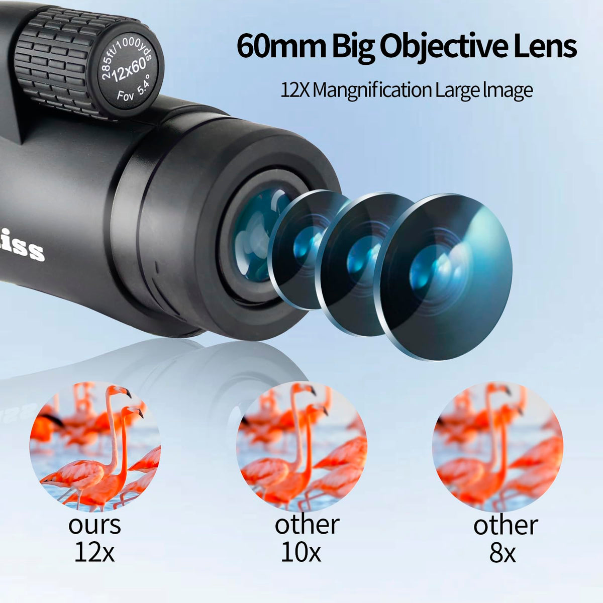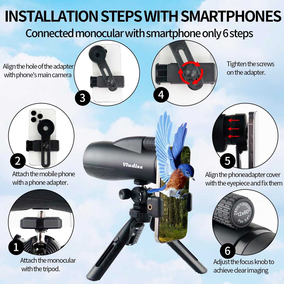 12X60 High Power Monocular Telescope With Smartphone Holder And Tripod, Large Vision With Bak 4 Prism And Fmc Lens Suitable For